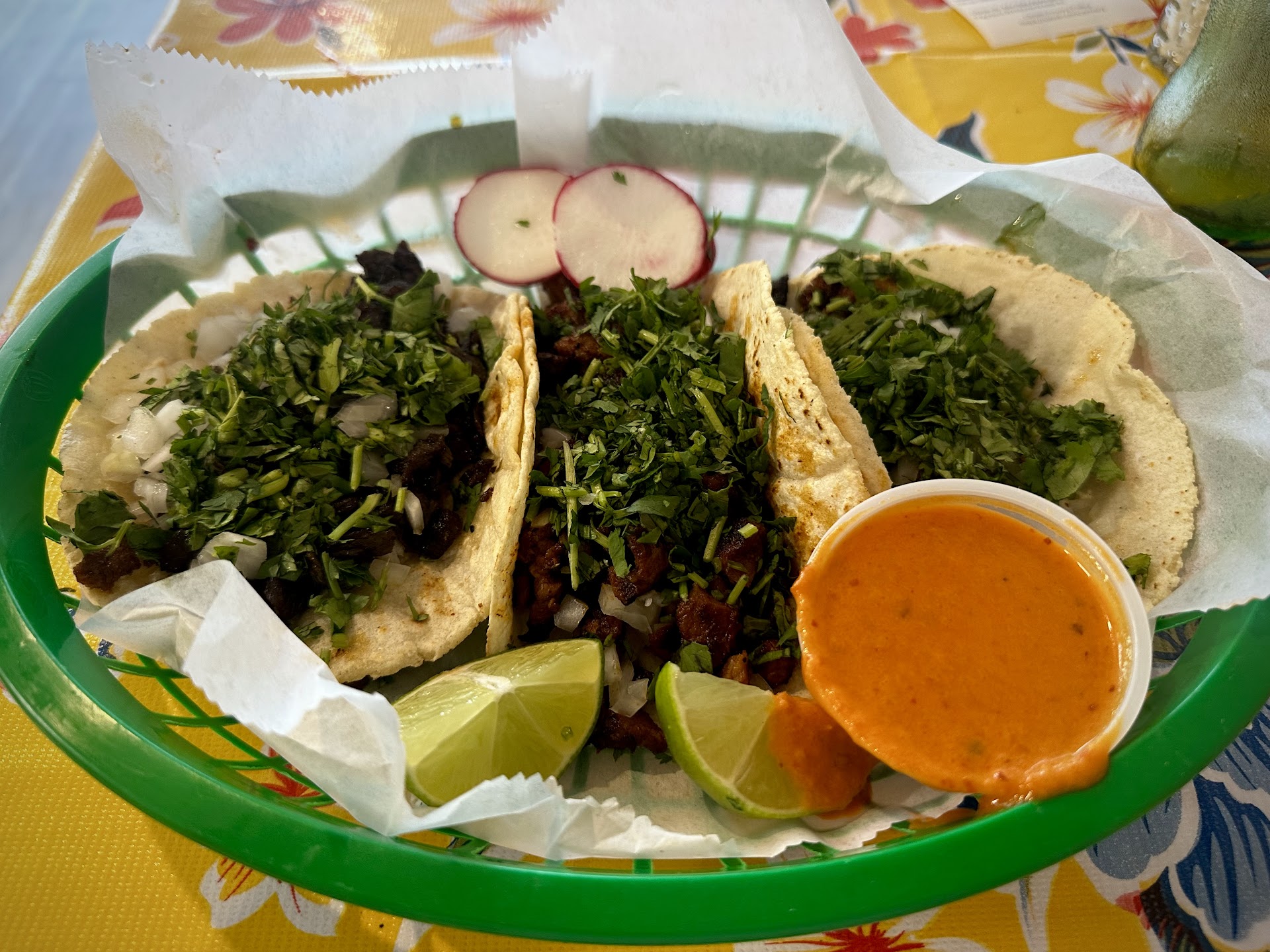 Each taco came on a soft and thick handmade corn tortilla (about 1.5 times the thickness of a standard tortilla) and was served with chopped cilantro, chopped onions, and a slice of radish.