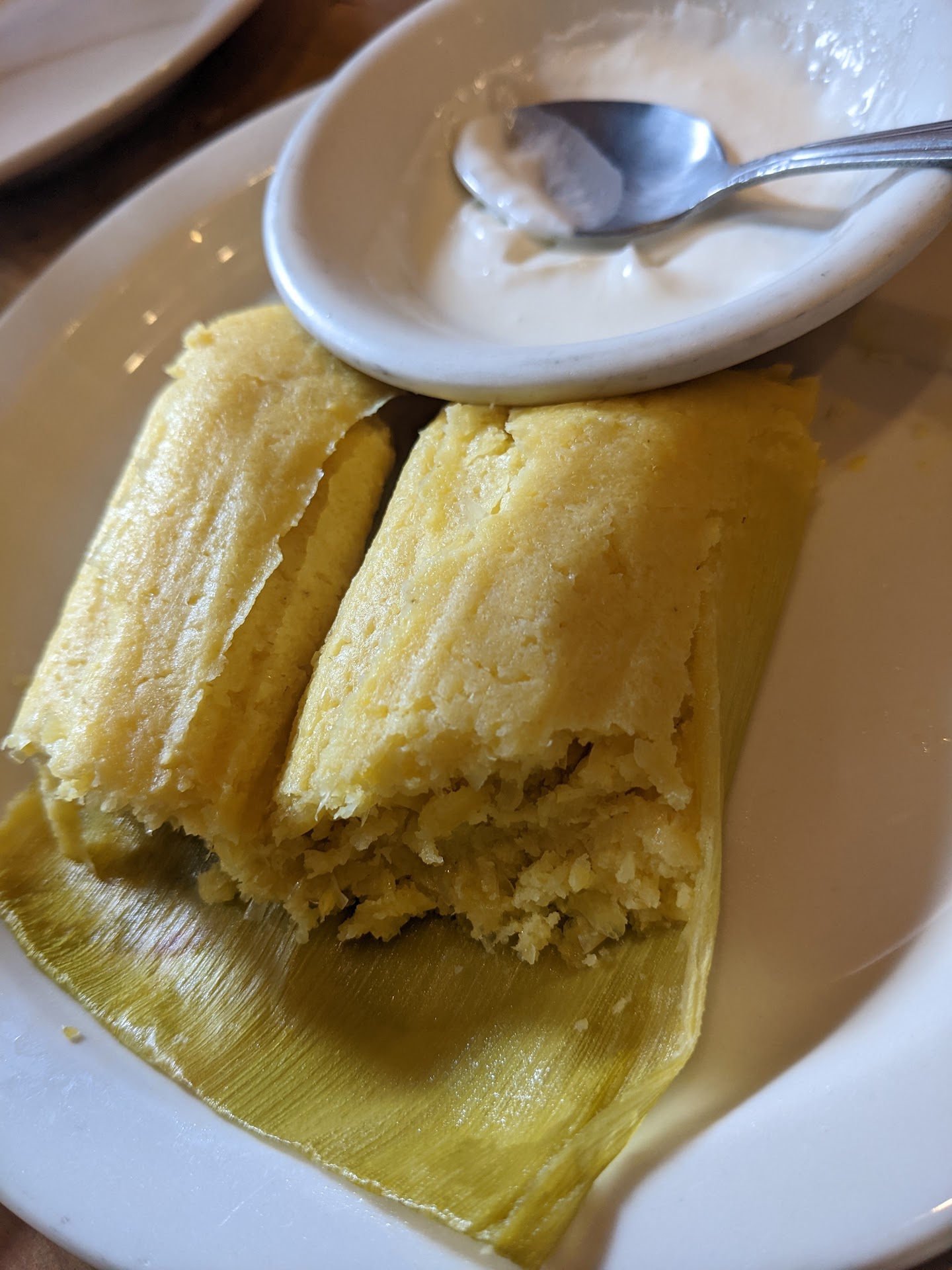We started with the Tamales de Elote which is this absolutely delicious hot corn mashed in a tamale served with cream sauce. It's salty, sweet, hot and perfect. Today was Pupusa Day and I tried three of them, cheese, cheese and refried beans and spinach and cheese. All were super filling and served with slaw and sauce on the side. They have a lot of great vegetarian options here.
