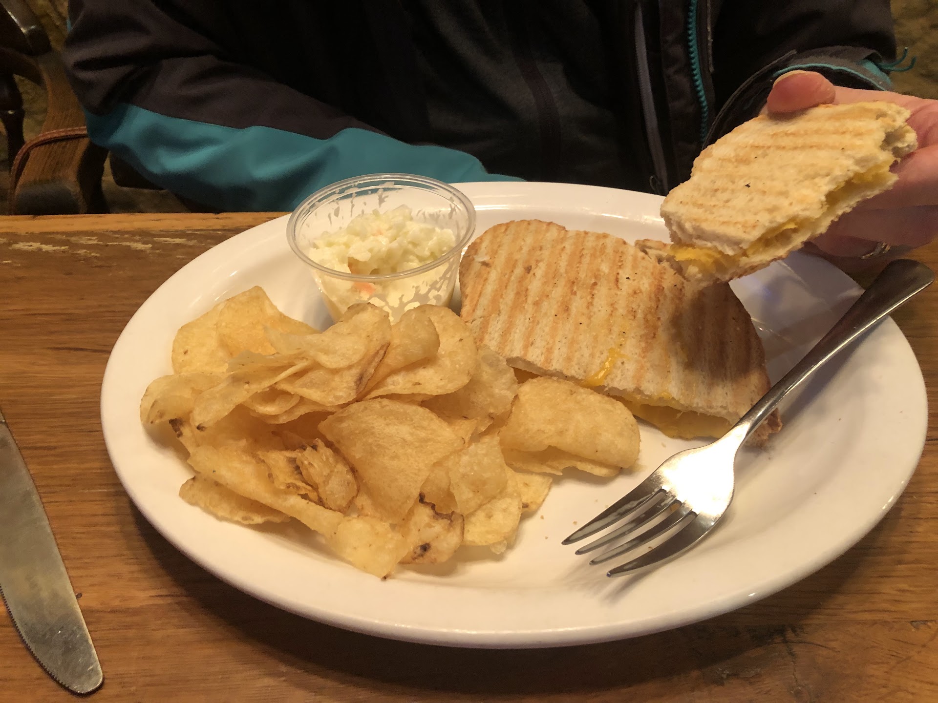 We got there and waited a half hour for our appetizer which we chose the spinach artichoke dip. The dip was luke warm and the chips looked like they came out of the bottom of the bag. There were a lot of tiny tiney broken chips and crumbs in the basket. Our food came about 45 minutes after we ordered. The fries were a handful of freezer burnt yuckness. Not even ketchup could save the fries that we had to pay extra for. The coleslaw and macaroni salad were warm and I didn't take a chance on eating much of it. They were out of the tomato basil chicken panini. We ordered sweet tea and it had a very bland taste so we switched to lemonade. The waitress seemed bothered that we are there. She didn't ask how the food was or offer any refills. For the three of us to eat here, it was $65 plus tip. We will never be back and or...