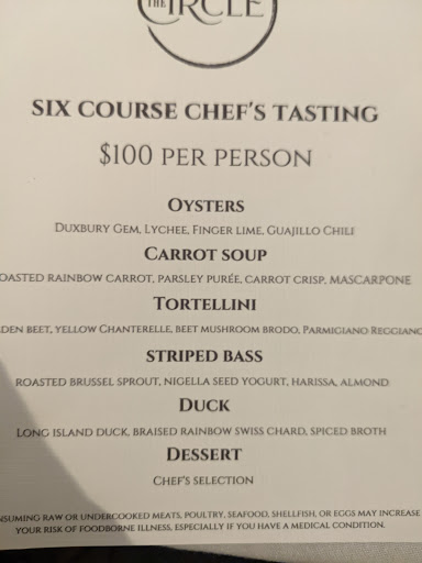 I am a foodie and I looked to NJ Magazine top 30 restaurants to find a new place to try. Out of the 30 for 2022, I have eaten at half of them within the past year. When considering value, the quality of food and service needs to be included for review plus the ambiance of the location. Comparing The Circle to other high-end restaurants in New Jersey, it falls short in service and catering to individuals who are gluten free. At other restaurants when I advised that I am gluten free, the staff brings out two sets of breads/chips. I also am not sure if the amuse-bouche served last night was gluten free. I ordered the foie gras which was served on toast, probably not gluten free. Michele, the waitress, should have advised me against it if it could not be served with a gluten free option. The menu looks as if it is printed on a weekly basis and gluten free options should be clearly marked. Thank goodness I am not a celiac but choose not to eat gluten. The service was mixed. Our water and wine glasses were left empty for a long time. I poured my own wine but could not refill the water glasses since no bottle was left at the table. Our dinner reservations were for 7:30 pm. I assumed that no one was going to be seated after us. There were also empty tables in the room. I felt rushed. The bus boy came by multiple times to clear our plates while during our conversation. As many of the reviewers noted, the portions are small. So if there is food left on the plate, we are taking a break to chat between bites, not necessarily done or full. The universal hint to staff that a patron is done eating is the fork and knife is left together at 5 o’clock on the plate. These are training issues that the chefs need to address with the staff. Now, lets look at the food. The presentation was beautiful, you eat with your eyes. The flavors were good for the foie gras and proteins of the main course, hanger steak and diver scallops. The steak came with 2 sides, steak fries and squash with smoked gouda. The smoked gouda overpowered the squash. We thought it was a cheese dip and not a vegetable side dish. The diver scallops did not come with any type of side or starch. The scallops were served more like an appetizer than a main course. Again, the portions were small and the waitress advising us that the menu is designed to make sure you enjoy 3 courses without being full should be a warning to all. The cost of our 1 appetizer, 2 main courses, and 2 cappuccinos was $160 before tax. Quality of food is 5-star but the lack of service, the small portions, and the limited options do not reflect the high value the...