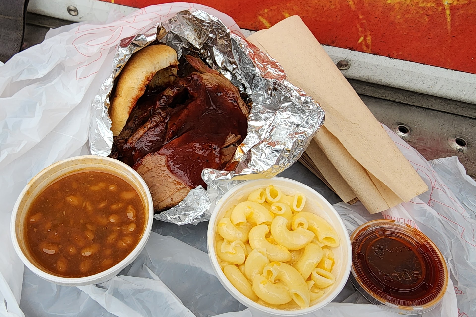 We were passing through the area and decided to stop. We ordered smoked mac n cheese as our sides and told they wouldn't be hot for 15mins. We decided to wait for it and it was just warm and tasted like macaroni with velveeta cheese and burnt charcoal, it wasn't a good smoke flavor. My bottle of iced tea was barely cold and my cheese steak was an open faced bun half burnt with about 1lb of meat, peppers and onions that were all charred. No way to pick it up. I tried esting it with my fork, but the flavor was so unpleasant, I ended up eating two bites and throwing it in the trash.