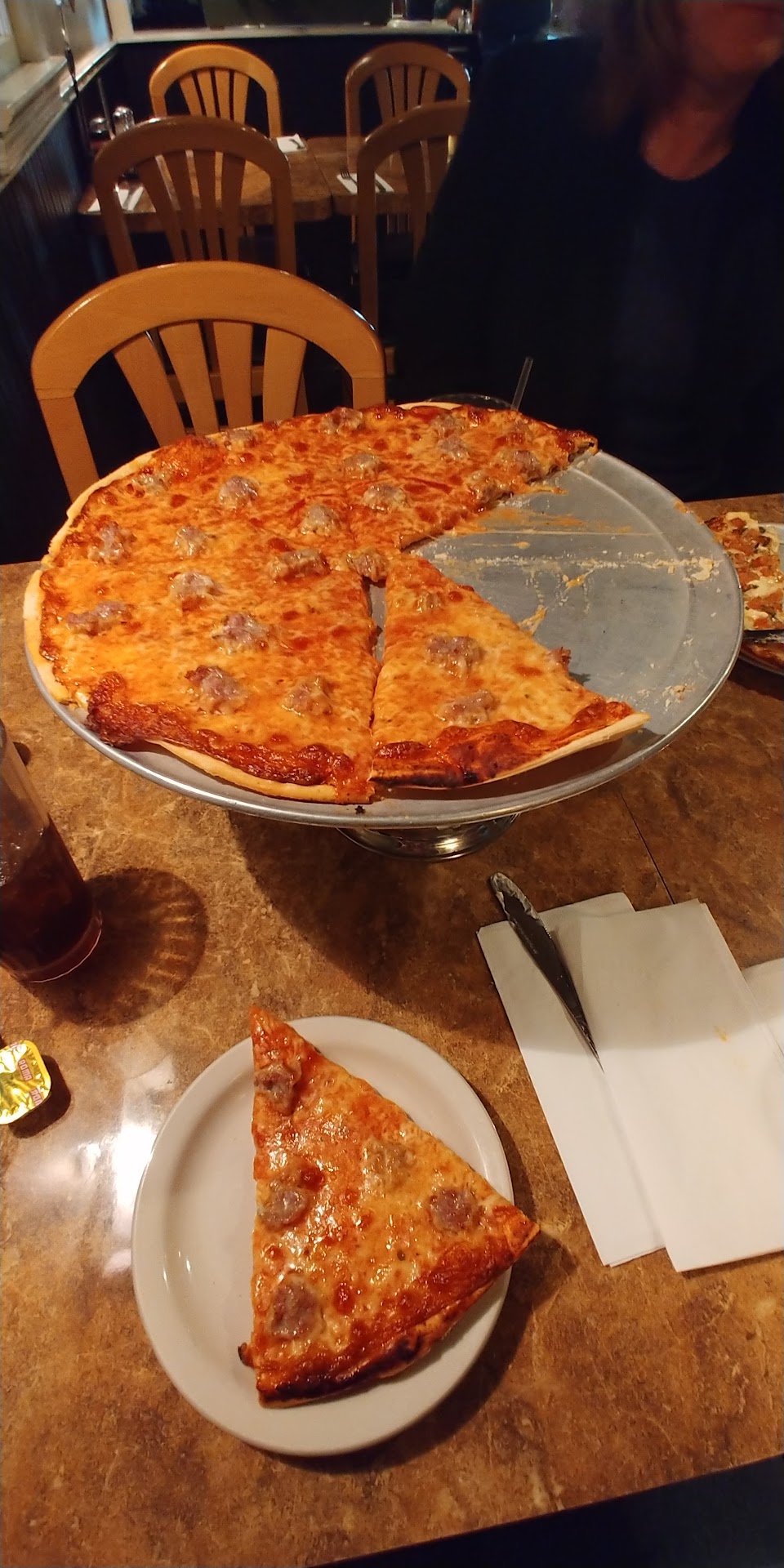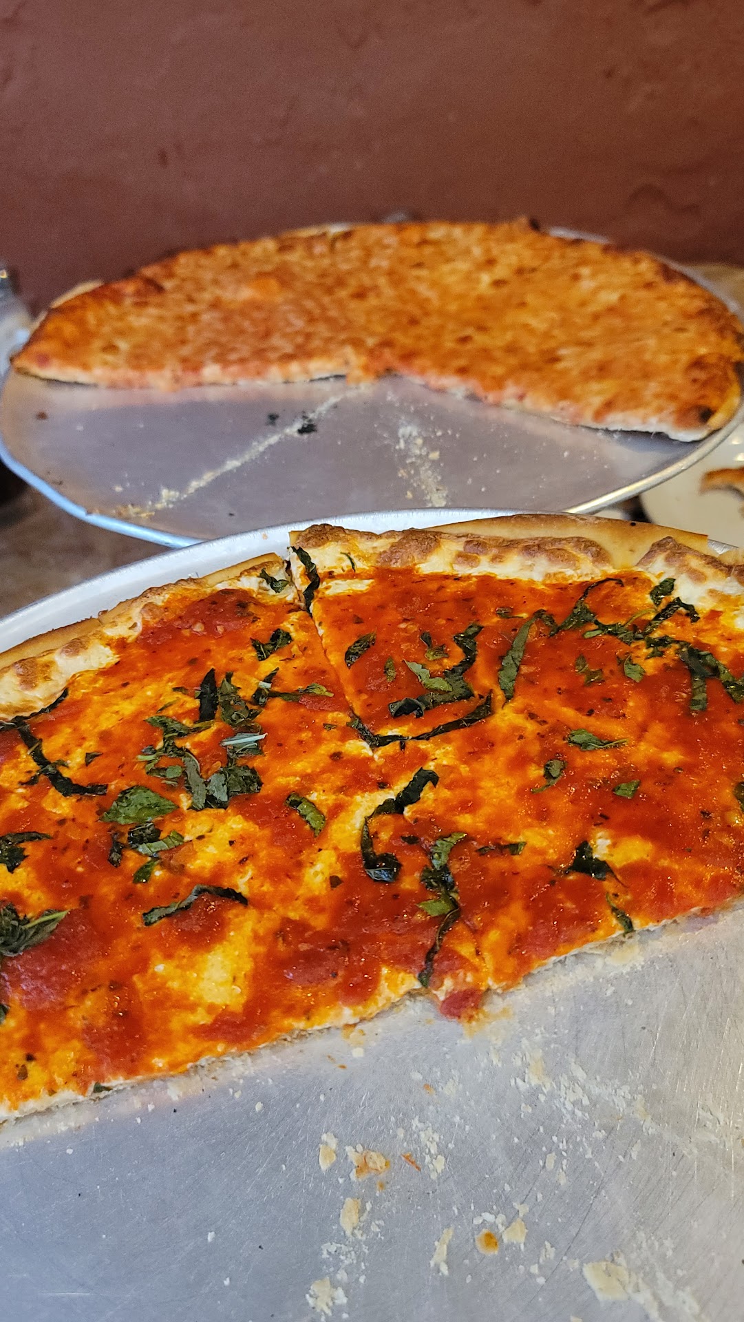 What an awesome pizza place. Food looked delicious too, but I came for the pizza. I did not do my research before. I had no idea that this place was similar to Frederici's in Freehold. Stumbled here accidentally because the name caught my attention and I am thrilled that I did. When ordering, I got the regular large cheese and, my newest "must have" is the Patsy pie. I will say, the original pizza is still better at the original Fredericis. Biggest difference, to me, is in the crust. Maybe the ovens are different here if they use the same ingredients. It's similar to the original, just a few notches lower. In my pizza book, I rate Frederici's a consistent 8.4 on the regular cheese pizza scale. I would rate this cheese slice a 7.6 which is still a very good slice. Now, to the star of the hour, the Patsy Pie. Now THIS is a terrific tasting pie. They use Marinara sauce here, fresh mozzarella, and topped with basil. This pie was a HUGE hit. Couldn't even go back and eat the regular once I started with the Patsy slice. Every bite was more delicious than the last. Cooked perfectly. Great flavor combinations that make my mouth water just thinking about it again. Super fresh ingredients and the mozzarella hugs the crust to create a terrific consistency in every bit. From what I was told, the vodka pie is also a big hit there so I have something to go back to try. For sure a must try if you are in the area and even a pizza pie worth driving for. Patsy pie just became my new favorite in the immediate area. Was fortunate enough to have Matt as my server who entertained my questions about the relationships and history of this place vs the original Frederici pizza of freehold. Broke down everything to me and clearly loves what he does. Rest of the staff was very friendly and courteous too. Went towards the end of the day with my wife and 2 kids and didn't know if I could get my kids to sit still. Called ahead a to go order which turned into a "we'll sit in and eat" order when we got there. The staff occomodated very quickly and got the food out very fast and warm. Awesome spot. Glad I "stumbled in" and highly recomend going. Again, aside from the pizza, the pasta dishes looked fantastic and the dining arrangement was full with people enjoying it. I was eating oitside and had to walk back throigh main dinig area to go back to my car. The dining room smelled great and the smell of fresh sauce and food got me hungry despite eating all this pizza minutes before. Highly recommend this place....you will not be...