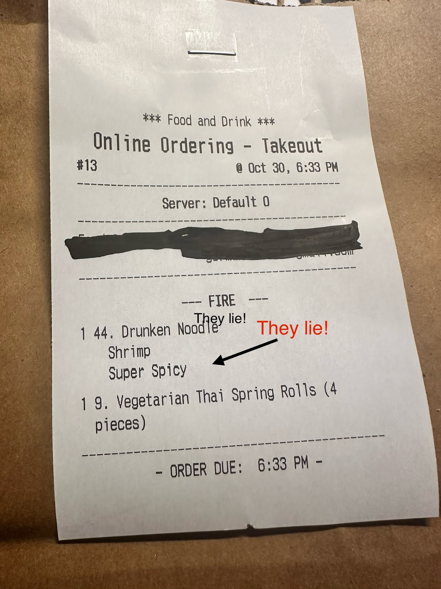 First and foremost, I must emphasize that I did not make any errors in my order. I explicitly requested a super spicy dish, as clearly indicated on the receipt. It is unacceptable for your establishment to attempt to shift blame onto me or any other customer due to your own shortcomings. Your attempts at deflection and the propagation of falsehoods have only reinforced my decision not to patronize your establishment again.