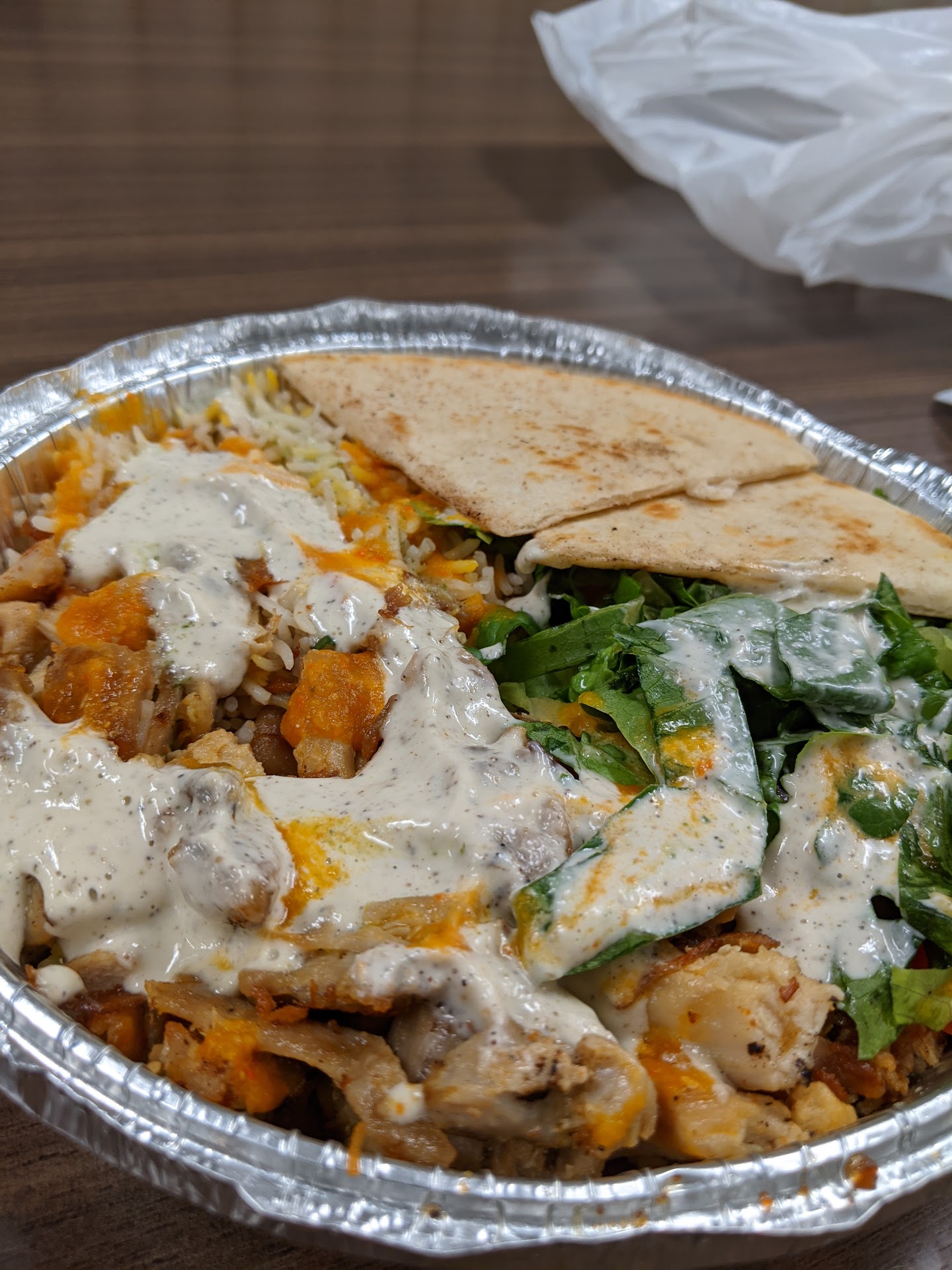 My wife immediately remarked on the portion size. One order could easily feed two people. Her beef gyro was spot on. The meat was crisped on the edges but still tender and full of flavor. My chicken was cooked and spiced perfectly. The container was packed with a bed of rice that acted as a sponge to soak up the flavors. The white sauce and hot sauce were amazing.