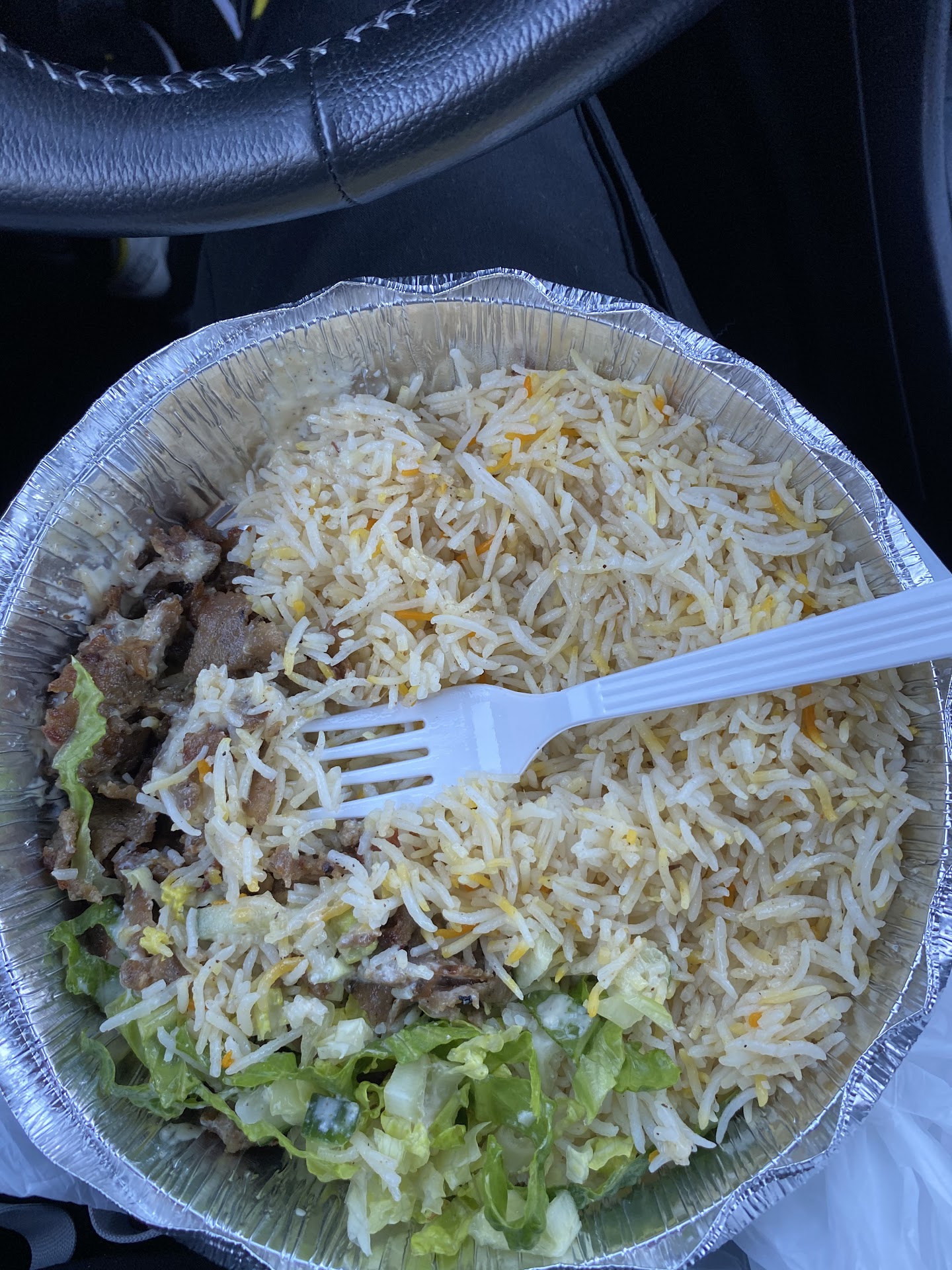 We had the Falafel with rice and salad. The sauce was spectacular and unique in its taste as compared to any other places I've tried at. The rice was perfectly cooked with an amazing flavor. Falafel was flavorful and not dry. A satisfying and filling meal!