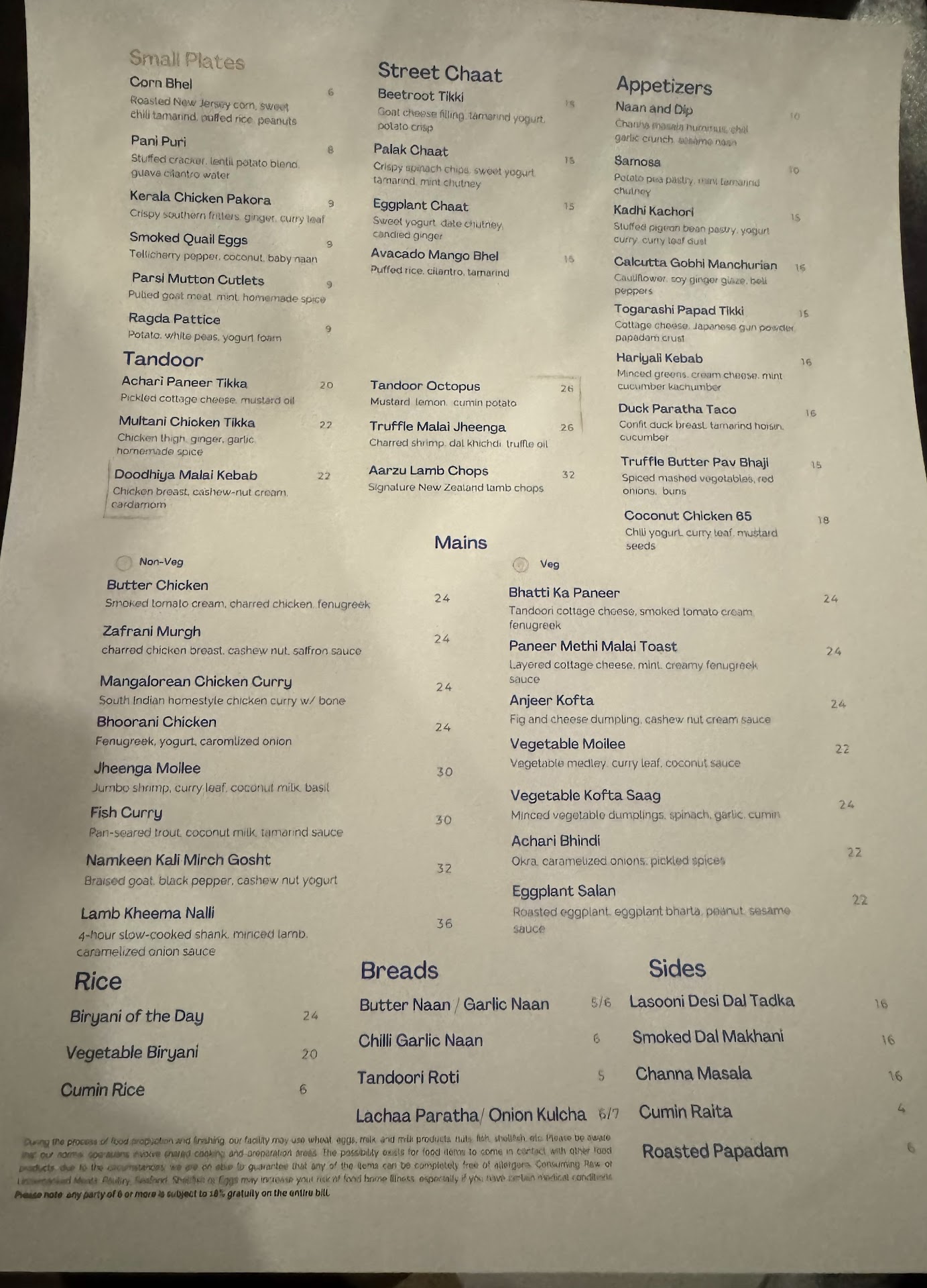 Service The service at Aarzu is polished and attentive. Our server Akshay was knowledgeable, eager to recommend dishes, and happy to explain the unique twists on traditional Indian cuisine. The pacing of the meal was spot-on, with courses coming out at just the right intervals, and we never felt rushed or overlooked. The staff also takes the time to answer any questions about the menu, which is helpful for those unfamiliar with some of the more innovative items.