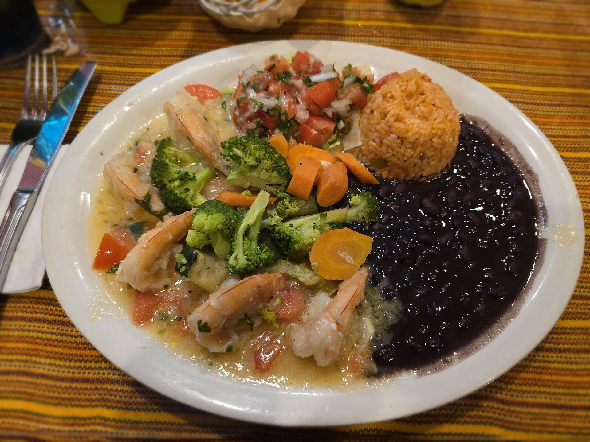 For my entrée, I chose the Camarones al Mojo de Ajo. The garlic butter and cilantro sauce had an amazing aroma, though it tasted milder than I expected. However, it paired nicely with the fresh Pico de Gallo. The shrimp were decently sized, with five on the plate. I substituted refried beans with black beans, which were tasty but a little runny. The rice was flavorful, though the portion felt small compared to the beans, throwing off the balance. I appreciated that the carrots and broccoli were cooked separately, maintaining their ideal texture.