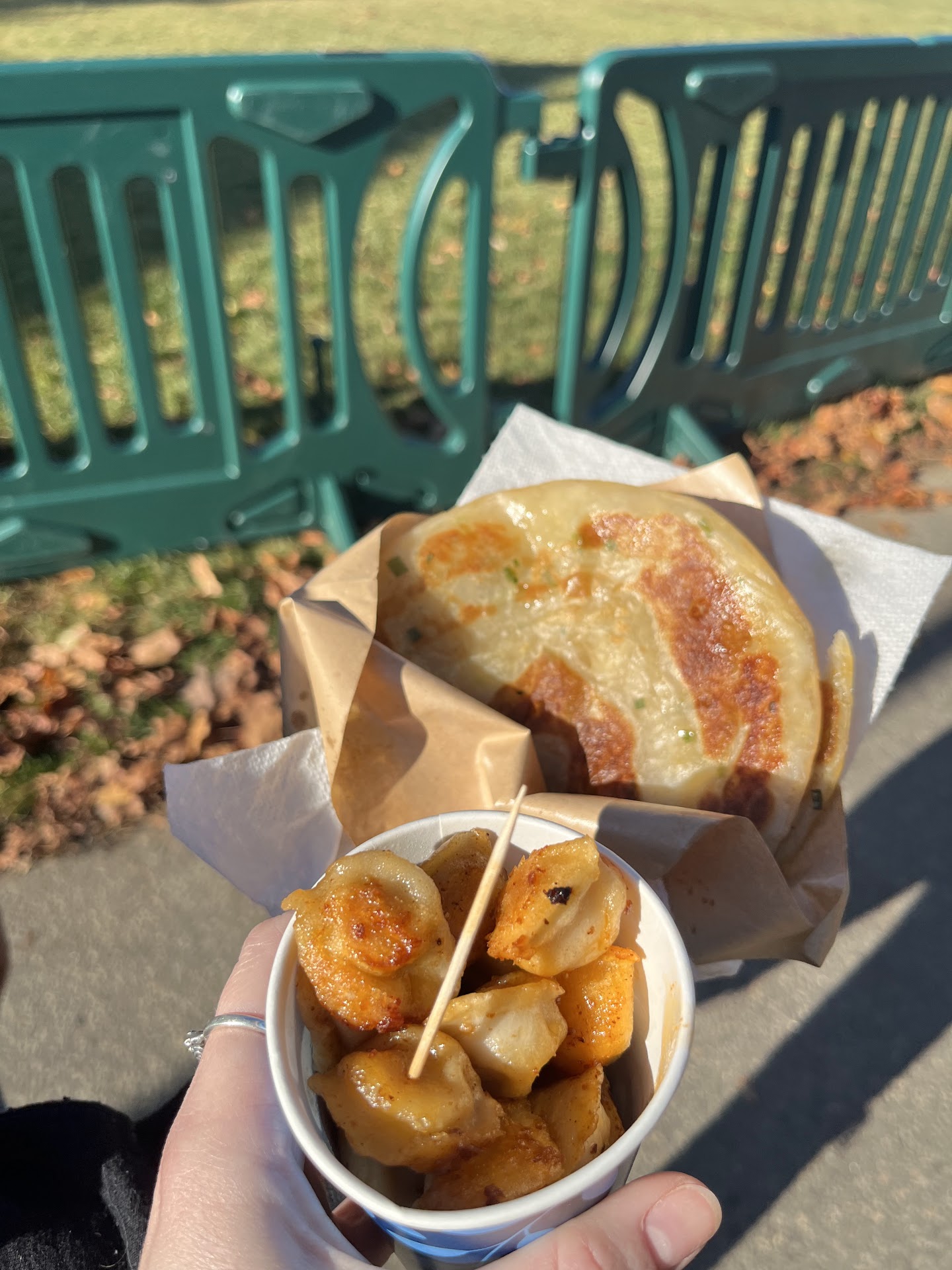 We ordered the chicken dumplings ($8) and the scallion pancakes (also $8 I think). The chicken dumplings are mini and you get a cup full (it is quite a lot). They were good but kinda cold because we had to wait a bit for the scallion pancakes, which were to die for!! Highly recommend! So much of her food looked and smelled delicious. I don’t think you could go wrong. She also has soy sauce, chili sauce, honey chili sauce, and one or two more sauces in a little self serve station on the side. Water bottles are $2 and Gatorades are $4.
