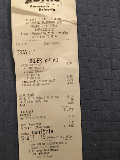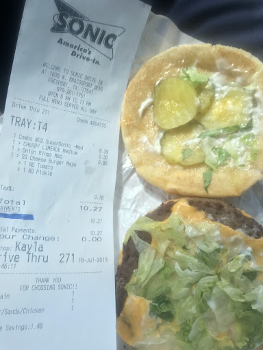 Read moreMe and my girlfriend had to sit in our vehicle and wait for the cops to watch the servalance cameras because the car hop clamed my girlfriend was there 30 minutes earlier with an older man and that she had given her a fake 100$ bill witch cant be possible because she has been with me every day all day for the past week .and then she said that the 50$ bill I used to pay for our food was the same 50$ bill she gave back to my girlfriend (who was never there ) earlier... to me it seems like she tried to pin her mistake on my girlfriend so that she didn't have to pay for it..... we don't even really like this sonic cause they never seem to get any orders right ,the food seems to always be cold ,and pretty much all of the employees are rude and have no manners.. this sonic is just all around horrible and dose nothing but make the sonic food chain look bad from now on I'm going to drive right past this sonic and go to the...