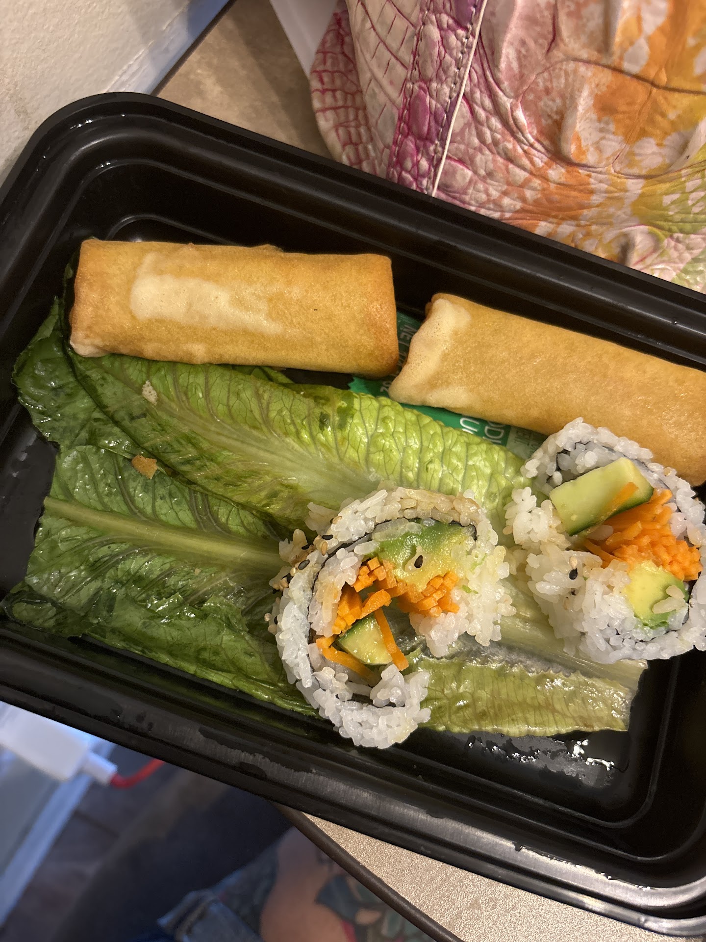 This was my first time ordering sushi from this restaurant. And I will definitely say it Will also be my last. I am an avid sushi eater and know a decent amount about how roles should be prepared ect. For starters, my âcrunchyâ vegetable spring rolls were completely soggy, and they were placed on a wilted leaf of Romain lettuce. (Photos to follow to demonstrate how soggy this âAlleged foodâ was). Also, my salmon/vegetable sushi rolls were barely rolled. You can tell it was either rushed or done with ill experience. You should be able to pick up a sushi roll with chopsticks or your fingers without the contents within completely falling apart. And also, when I picked up the food originally, my hot contents were placed with in the same bag as my cold contents, when they shouldâve been placed in a separate bag. The moment Sushi is prepared, the integrity of the fish begin to deteriorate within minutes, thatâs why itâs meant to be kept chilled or eaten immediately after. Not stored with hot food.. This also poses increased chances of foodborne illness. Not happy! If you donât eat sushi often, or know much about the art of hand crafted rolls you might find it okay. I found it subpar at best. Also, just know- this is more of a walk-in/takeout kind of restaurant. Not really meant for...