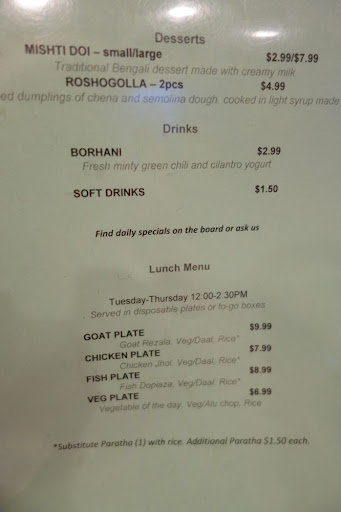 Read moreWe went here for lunch. The order consisted of Fish chop: This was the only perfect thing here. The coating was thin and the potato-fish stuffing was good. Sadly it went downhill from here; Kachuri: Very oily. The pea filing was okay but the bread itself was raw in parts. Seemed like it was cooked at wrong temperature. Paratha: Same thing with this one. Very oily. Not great taste. Morog polao: There was something really off. The serve ware was too small to mix the polao and masala was accumulated in parts on the sides of the chicken quarter. The tate and flavors were very inconsistent in the single entree itself. Also the menu mentions it as "Chicken BIriyani" it is not at all a bengali biriyani or any biriyani. Please correct the menu. It is misleading. Chicken kosha: This entree was ok. It had 4 small chicken pieces. However the gravy did not taste like a kosha gravy and was more like normal chicken curry. Roshogolla: We've had roshogolla in Kolkata, India and it wasn't even remotely close. Mishti doi: Had mishti doi color but did not taste great.