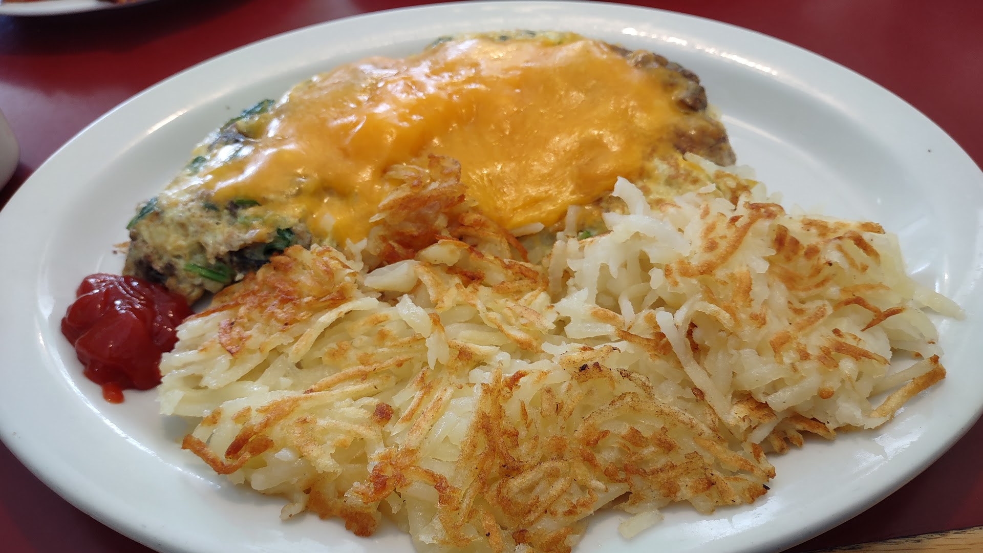 Unfortunately, there was a small hiccup with my all-meat omelette. I had requested jalapeños and cheese to be added, but they were initially missing. After bringing it to their attention, they promptly added them. However, in the process, my omelette ended up overcooked, as they put it back on the skillet.