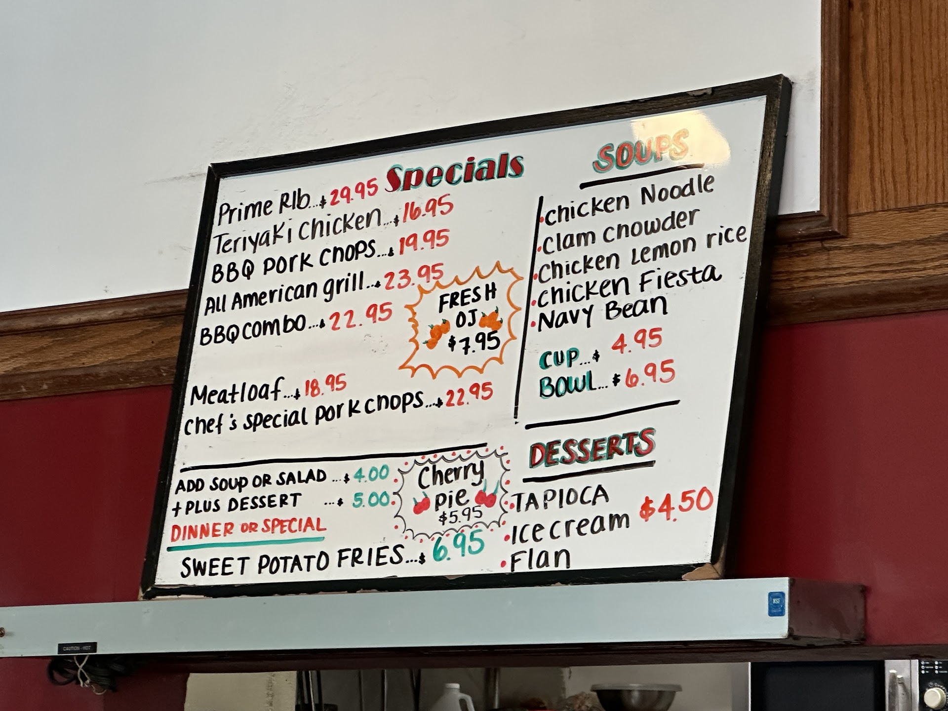 Cons: restaurant feels small after your walk in, booths and benches were in need of repairs, we had to wait a bit longer than we like for our order, although service was good, but not as efficient as it could be, again, manager/owner was working very hard, she could have delegated better or hired an extra person for busy times. (Then again, right now it's hard for any business to find good help)