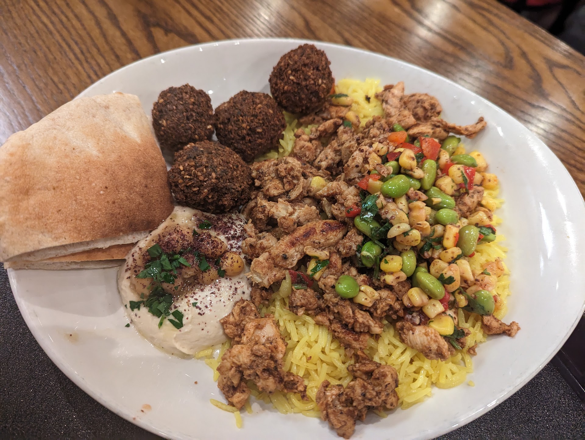 We took the dish back to the cashier, and after a brief confusion, they took it back and brought out the falafel pita bread. My mood was off and I somehow ate about a third of it, and then noticed an eye lash/hair on the plate. I was just done at the point and went to the cashier to ask for a refund. They agreed to give me a refund and casually asked if I didn't like the dish. I said, well, first, it was chicken, and then... The cashier interrupted me and said it's ok, meaning, they didn't want to know. I did tell them anyways there was an eyelash in the food, but they didn't want to know. They refunded my money and I left the restaurant hungry.