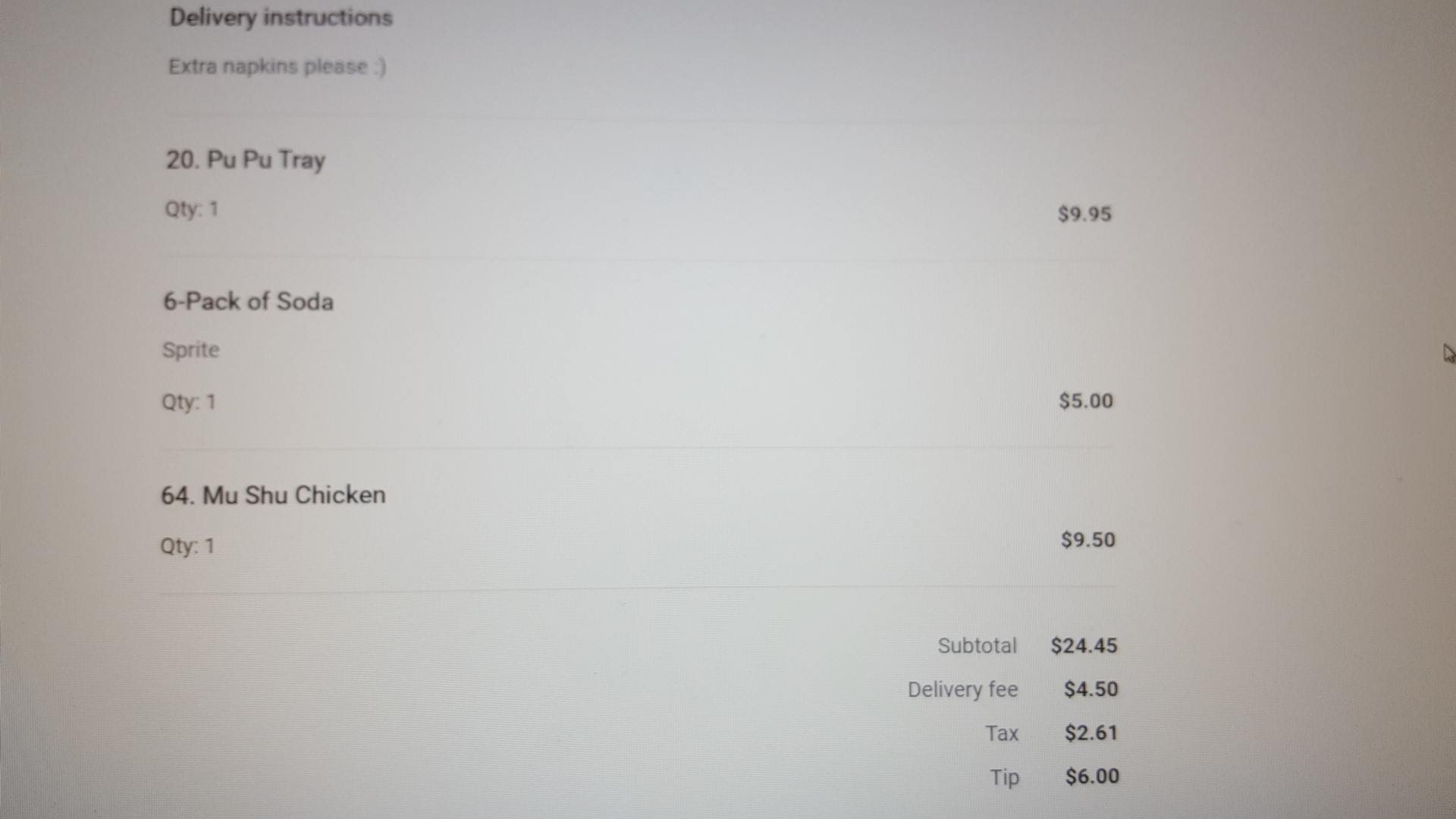 Ordering online is a snap, as it uses Grubhub's back-end. Just click on a menu item to add to your cart. The menu itself is immense, absolutely anyone will be able to find something they're familiar with. I got the Pu Pu platter, Mu Shu chicken, and some cans of soda. The Pu Pu platter (appetizer sampler) was so chock full of items, it had to be packaged in two full size takeout containers. Everything was fried just right, and tasted excellent. My favorite was easily the potstickers.
