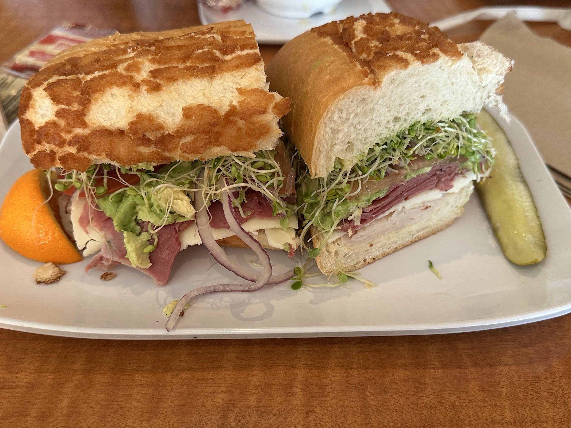 I had the house green salad and it was filled with so many fresh veggies, (sprouts, red pepper slices, chickpeas, cucumbers, red onion, topped off with croutons..the works!) it was such a hearty n' healthy lunch that I ended up enjoying it more than I thought I was. I also went back and bought my 14 year old picky-eater-son his own salad because after "just wanting to try it" he kept eating mine.
