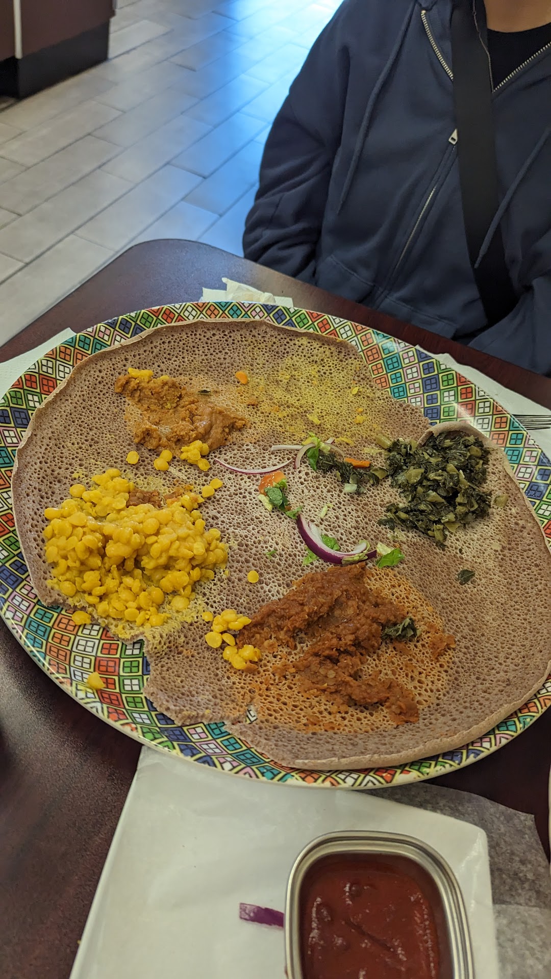 We bravely ordered Lentil Sambusas (the Ethiopian answer to samosas, because who doesn't love a good lentil-filled pastry?) and a Veggie Combo Platter featuring the likes of red lentils, split peas, atakit wot, and gomen wot. Being filled with lentils, the sambusas felt practically virtuous. The platter was a veritable garden on a plate, complete with three additional crepe rolls and a rainbow of lentils and greens. The sheer volume of food was astounding; we practically needed a crane to lift ourselves out of the chairs.