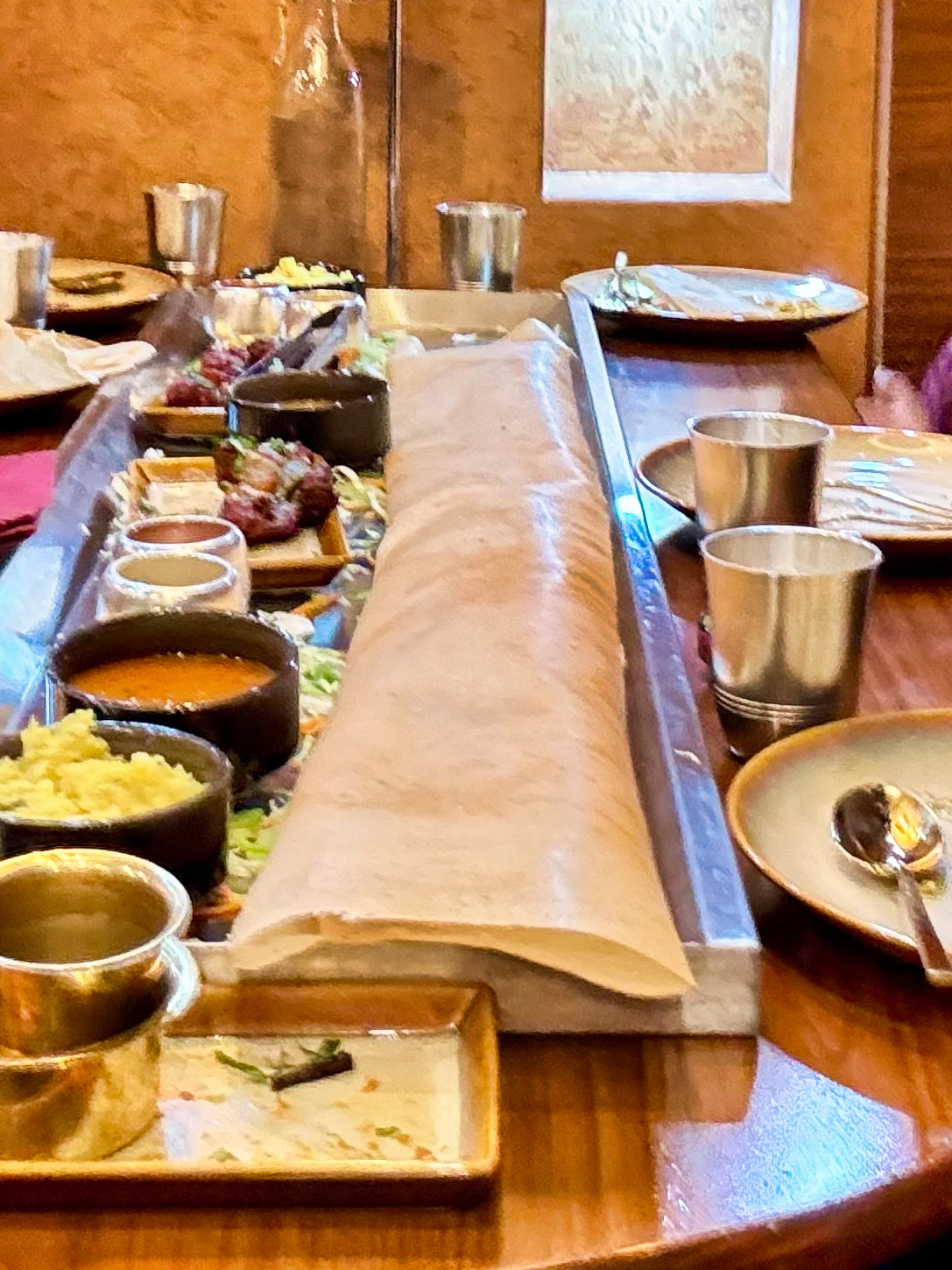 Negatives: The timing of dish delivery was poorly managed. Appetizers and the 4ft Dosa were served simultaneously, leaving no space on the table. The waiter’s reluctance to assist in arranging space added to the frustration. Plates and cutlery were unclean—we found leftover chocolate on a spoon, and chai glasses weren’t properly washed. Cutlery and plates falling to the floor went unnoticed by staff, despite there being ample waitstaff available. This chaos seems to stem from a lack of proper organization and planning.