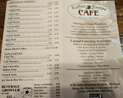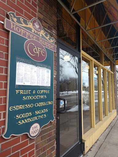 My friend and I had lunch at the Koffee Kuppe on May 31. I have had drinks before but never food. It was great!! The young man who took our order was pleasant, helpful, and joked around with us as we joked. I ordered a Michigan Salad and my friend ordered a granola peanut butter honey wrap thing. I don't remember what it was called but it looked tasty 😋 There were 3 people in the tiny space behind the counter who seemed to work together well. Our order was very quick and I was amazed at the size of the portions!!! My salad was a huge plate of greens with apples, dried cherries, chicken, and feta cheese with a poppyseed dressing. PLENTY of everything! I took half of my salad home. My friend was going to take part of hers home too but it was so good she just kept eating it! I also had a mint mocha coffee and it was perfectly hot and TASTY! Some of the best coffee I have had. The atmosphere was a pleasant mix of casual cafe with light music playing but not so loud you couldn't visit over lunch. A thoroughly...