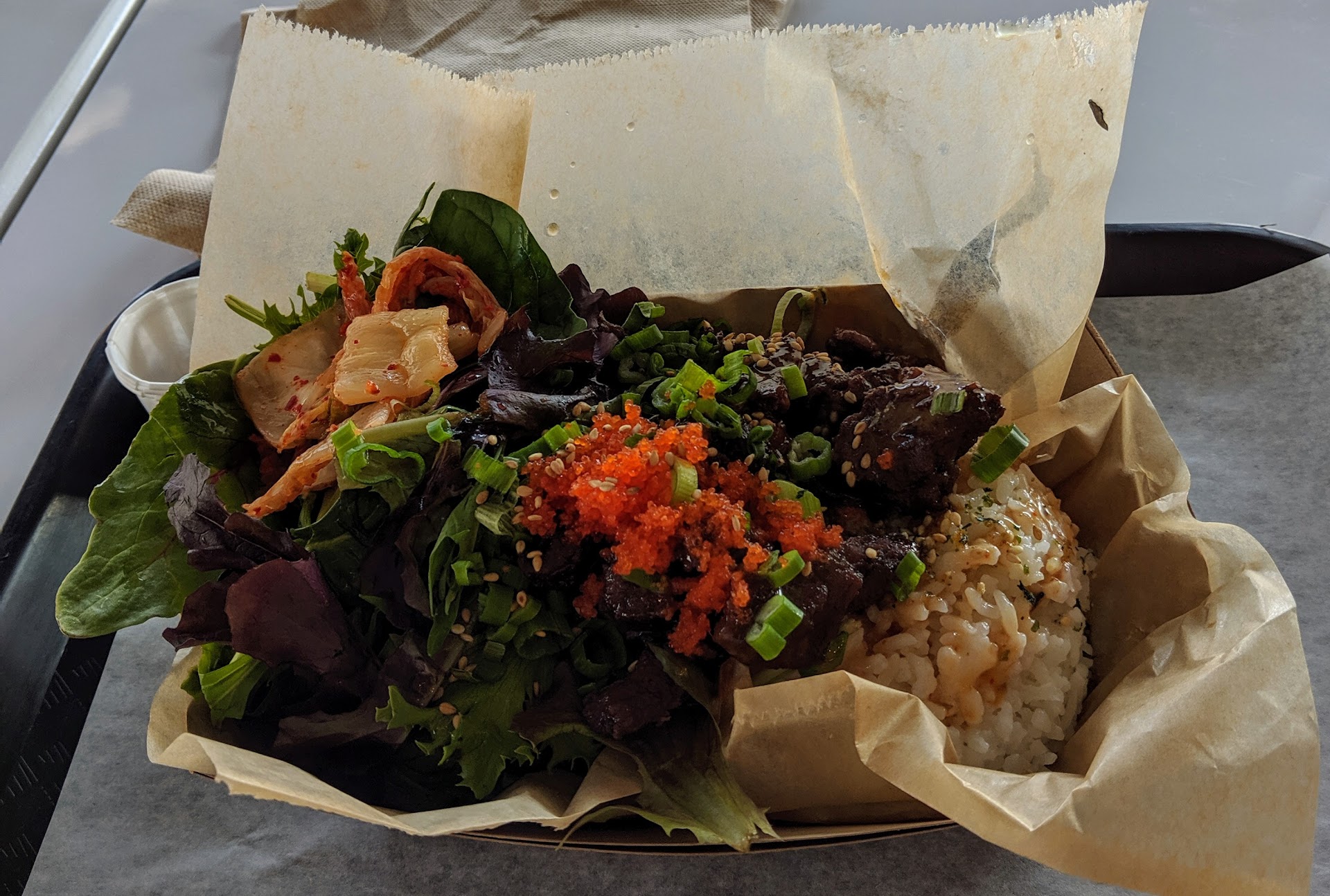 I love this restaurant food concept - fusion maybe if I have to describe it? The rice bun is a good concept as well. I ordered kamikaze fries and rice bowl ribs without any additions or taking out anything for the first time so I have a gauge on how I wanted to customize my next order. The rib flavor is good - it's on a sweet side (you might not be a fan or prefer your ribs with different flavor or more umami taste but I don't mind and I like their ribs how it is). The brown rice with furikake is great option for rice. The meat size, how it's all cut - is proportion for bite sizes which is nice. Basically the bowl concept has meat, rice, greens, and kimchi - I think for me it's a good healthy balance: I have my carbs, meat, green, and side. The fries has good flavor (a bit spicy for me - but that's me. Some prefer it spicy). The meat to fries ratio is enough to enjoy the flavor. In regards to proportion and price - everyone has different standard on these so I'll let you decide on how you define these after you tried yours. Highly recommend to give Koja a try. Kudos Koja for using environmental friendly...