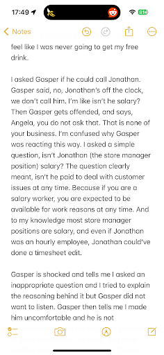 So I asked if I could speak to Jonathan, the store manager regarding this, and Gasper tells me, no, he was the manager on shift and he’s the one enforcing the rules. Gasper also said Alex isn’t here today to verify this happened yesterday. So he can’t do anything about it. So I pay for my drink.