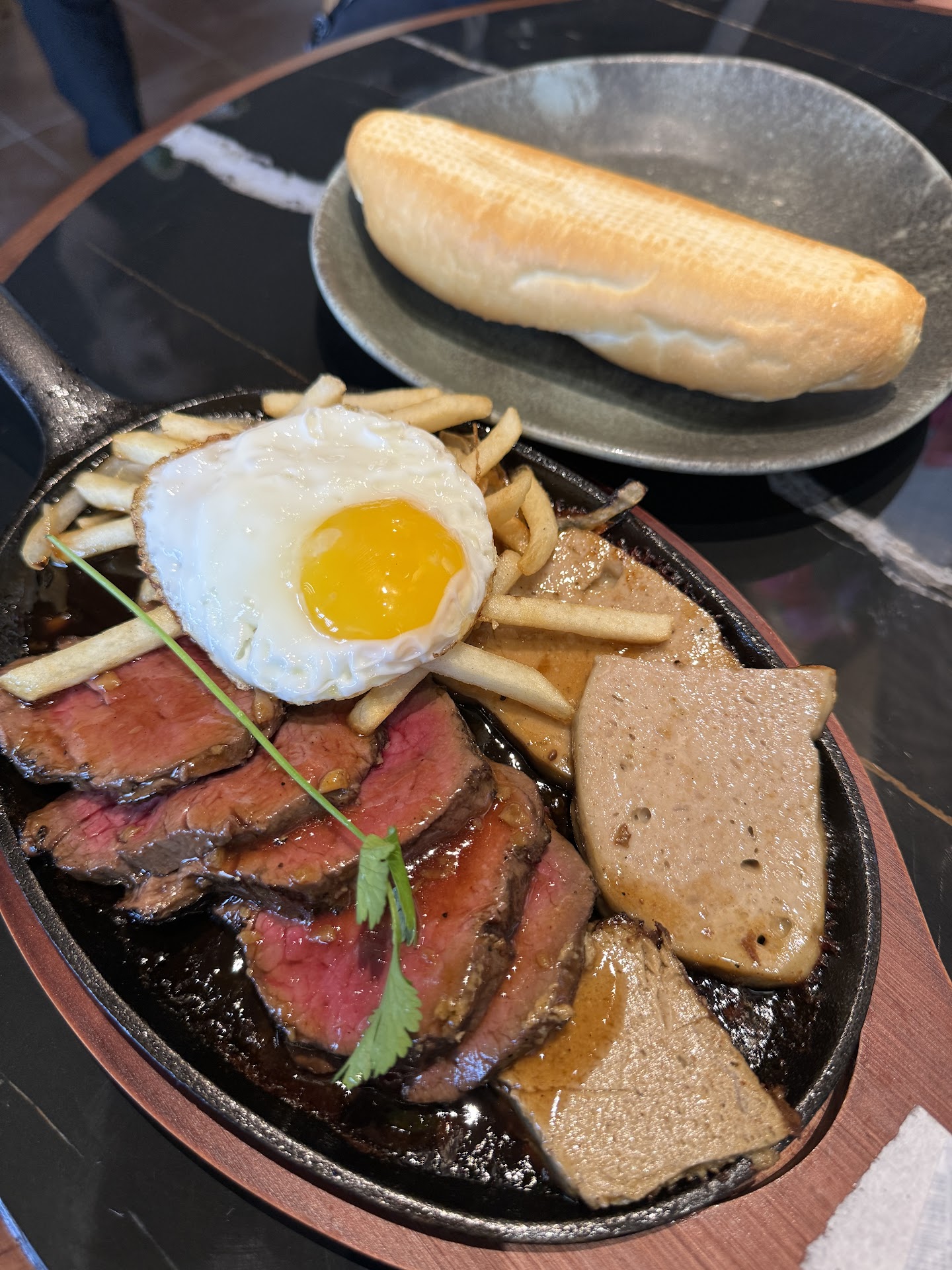 Pricing is above average in an area where Vietnamese restaurants are a plenty but the quality is usually better. I say "usually" because we ordered the short rib pho and the meat was really tough and hard to chew. We've had it previously at their PA location and it was perfect. So maybe its because they're working out kinks still, but for this visit I'd give the short rib pho a 3/5. The Sizzling Steak Plate is $28.95 and includes tender steak, a slice of a buttery patè, fries and a small baguette. There is a 15 min wait prep time but they got it out super fast. It definitely was not sizzling when it came out, but it was tasty and the sauce was really good.