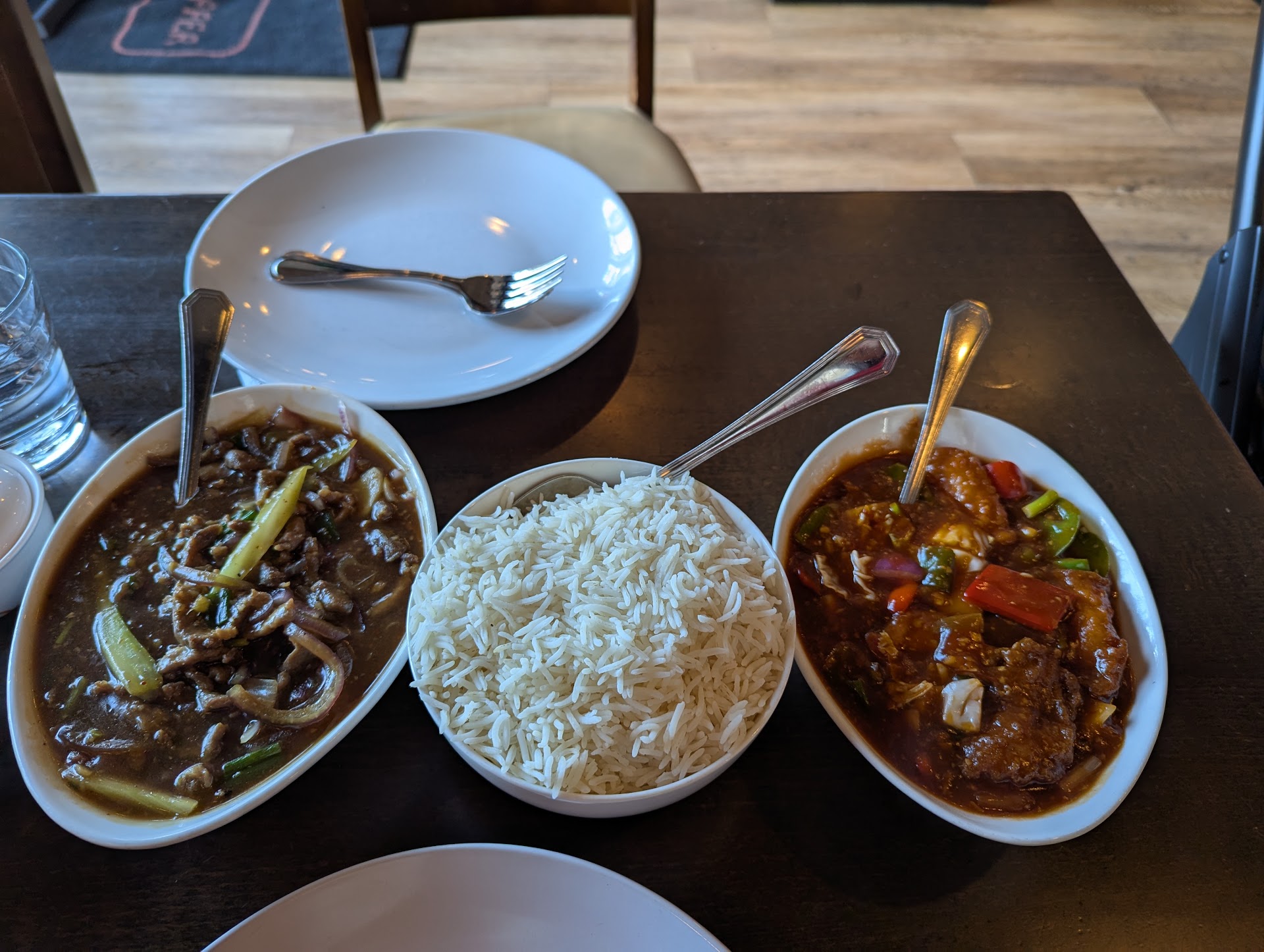 We were seated immediately and ordered shortly after. I did not appreciate being told I need to order rice. He said the dishes were saucy and I can appreciate a tip from the server but I didn't like his insinuation that it's unthinkable to order two entrees with no rice. My husband felt the rice helped him be full from the meal, otherwise, he would have left hungry. I ate the dishes without the rice and I was fine. It's a personal preference that I don't take plain rice with my meals. It also bothered me that the order of rice was huge and costs $10. Typically, it's a few dollars for a smaller portion of rice. I can't decide whether it's the large portion of rice or the $10 that bothered me more when only my husband was partial to the rice. We took the remaining home so it would not be wasted.