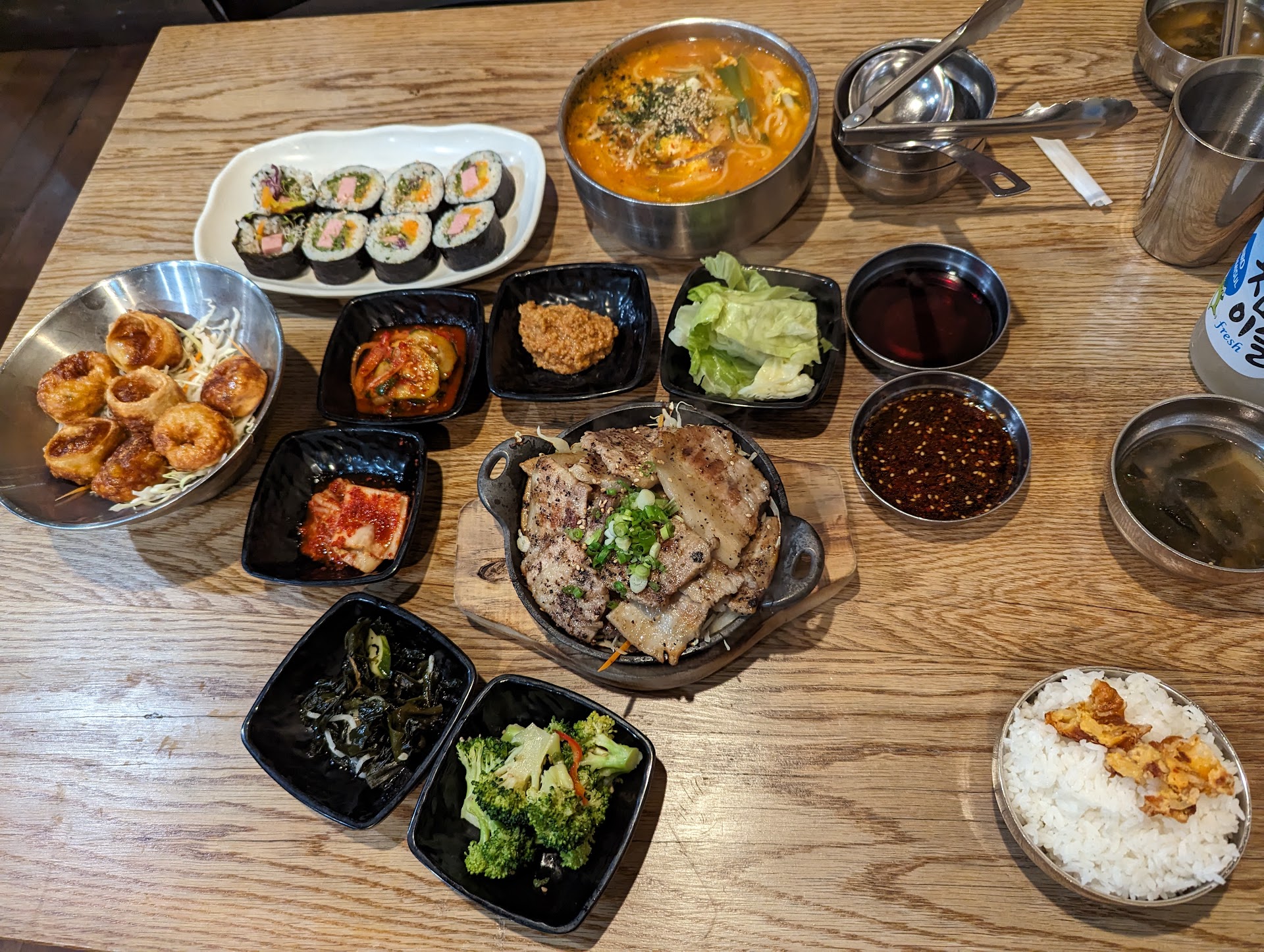 Food tasted like frozen section of KP market that was heated up. Service was not good. They didn't refill our empty bottle of water used to refill our own water cups. Water cups smelled gross before we even poured the water in it. They didn't refill our kimchi. Basic service for a Korean place with barely any ppl in it was lacking. I give 2 stars because they had a smile on their face but no sense for how service in a Korean restaurant should be. Kimchi dumplings did not taste like kimchi or had any cabbage in it at all. And we mentioned it to them but nothing was done about it. Spam kimbap was just raw spam cut up and put in it. Atleast grill the spam first. Pork belly was flavorless. Menu says there was suppose to be lettuce too wrap the kbbq with but it never came out. Cabbage was just steamed and unseasoned. Not even a little salt. Pork Belly tasted like it was boiled and then pan fried. Not very flavorful and soft. The Korean Noodle Soup was kind of salty and spicy but not much as far as flavor. There was a little flavor but not much. The noodles absorbed into the broth so easily and made the broth thick even though the soup was still really hot. We didn't like the thick broth. The Job's Tears drink tastes like the little packets you get in a box from KP market. Just mixed with water. Nothing special about it but...
