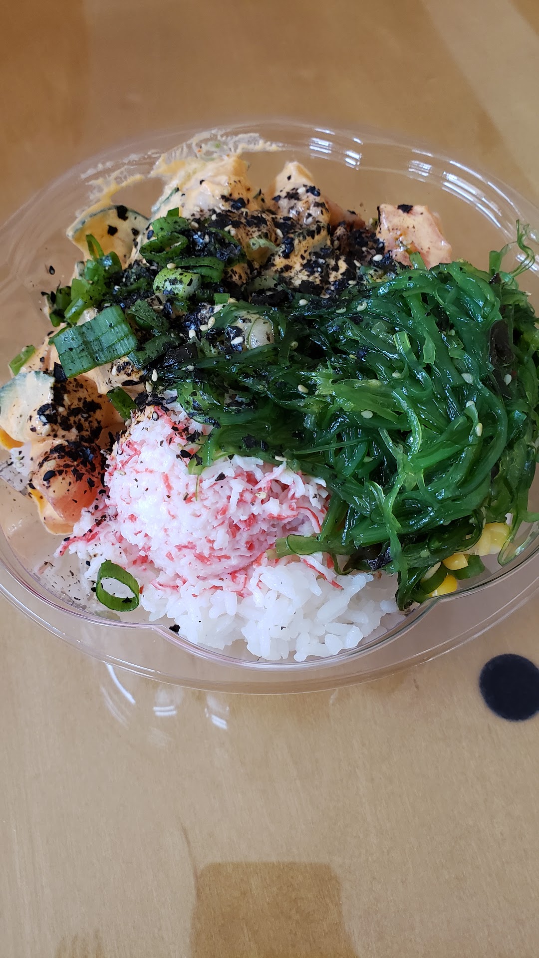 Back to the food: I got a regular Poke bowl---which is somewhat like a Japanese chirashi-don, but with Hawaiian poke rather than sashimi---for around $10.40. Sunfish offers a decent selection of seafood "protein" options (so stated on the menu), running the gamut of salmon, hamachi (yellowtail: one of my personal favs!), octopus, spicy tuna, etc., and tofu for vegetarian options; a good variety of carbs like sushi rice, brown rice, yams, and/or salad greens for the more health/weight-conscious.