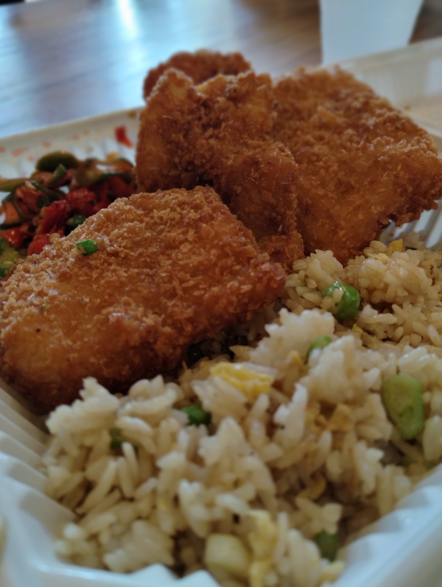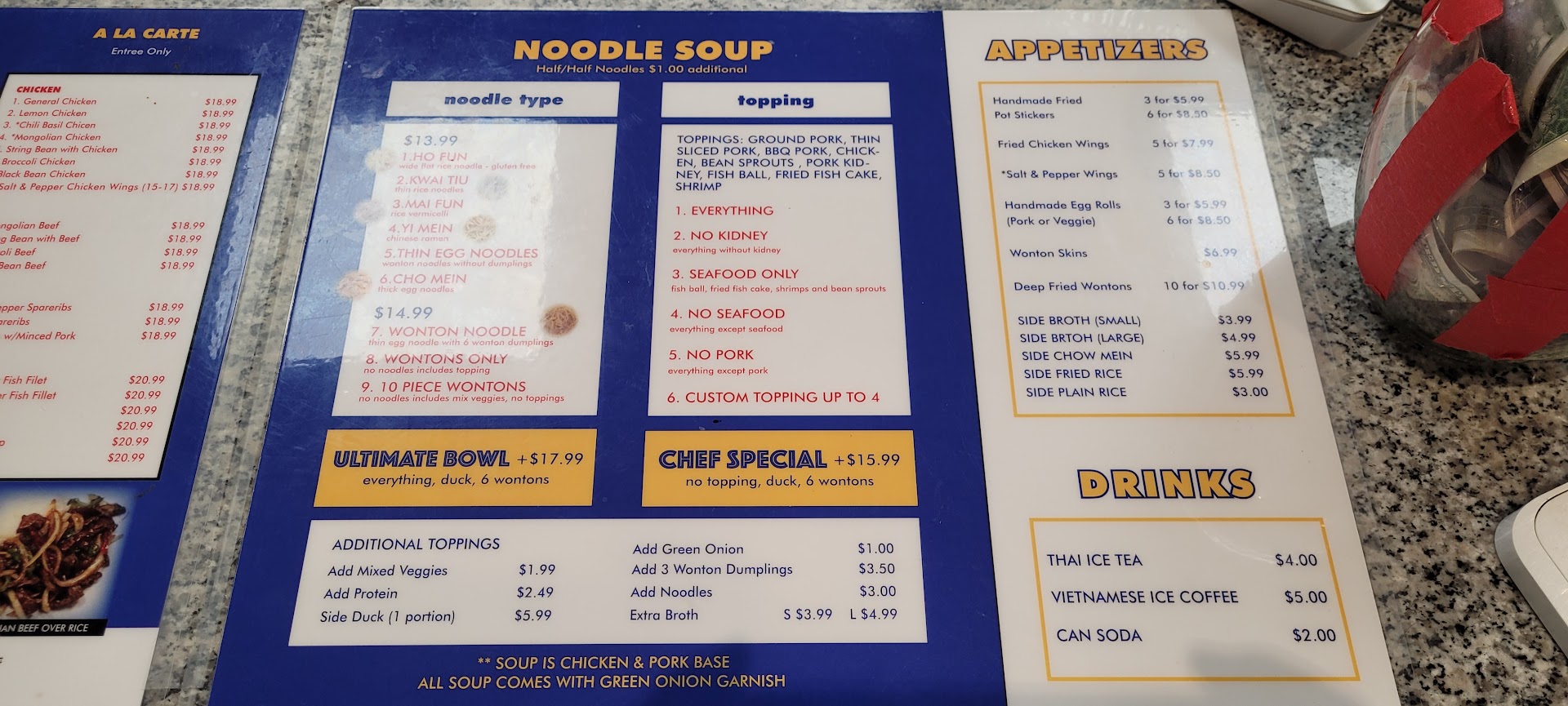 Not a complaint since I understand the plethora of companies nearby with employees that take lunch breaks around the same time, but the lines are usually very long from 11:30-1:30. We haven't had much of an issue getting a table by the time our food arrives though. My boyfriend and I always split one bowl/plate and are well fed by the end. It's okay but not completely amazing. We had the Ultimate Bowl with all the toppings and due to the rush, it seems they forgot the shrimp and fish balls, but we didn't know until the next time we saw another bowl brimming with toppings. The next time, we ordered the salt and pepper ribs with chow mein. Noodles were thick and delicious, a little greasy but not excessively so. I liked the taste, whereas he liked the fact that unlike Panda Express's, there weren't vegetables breaking up the texture ._. Actually, there weren't many vegetables at all in the meal, but oh well. The salt and pepper ribs...weren't too great. I didn't expect them to be fried, but the issue was they were mostly bone rather than meat. I know there are bones in ribs, but not only so. They were also a little...