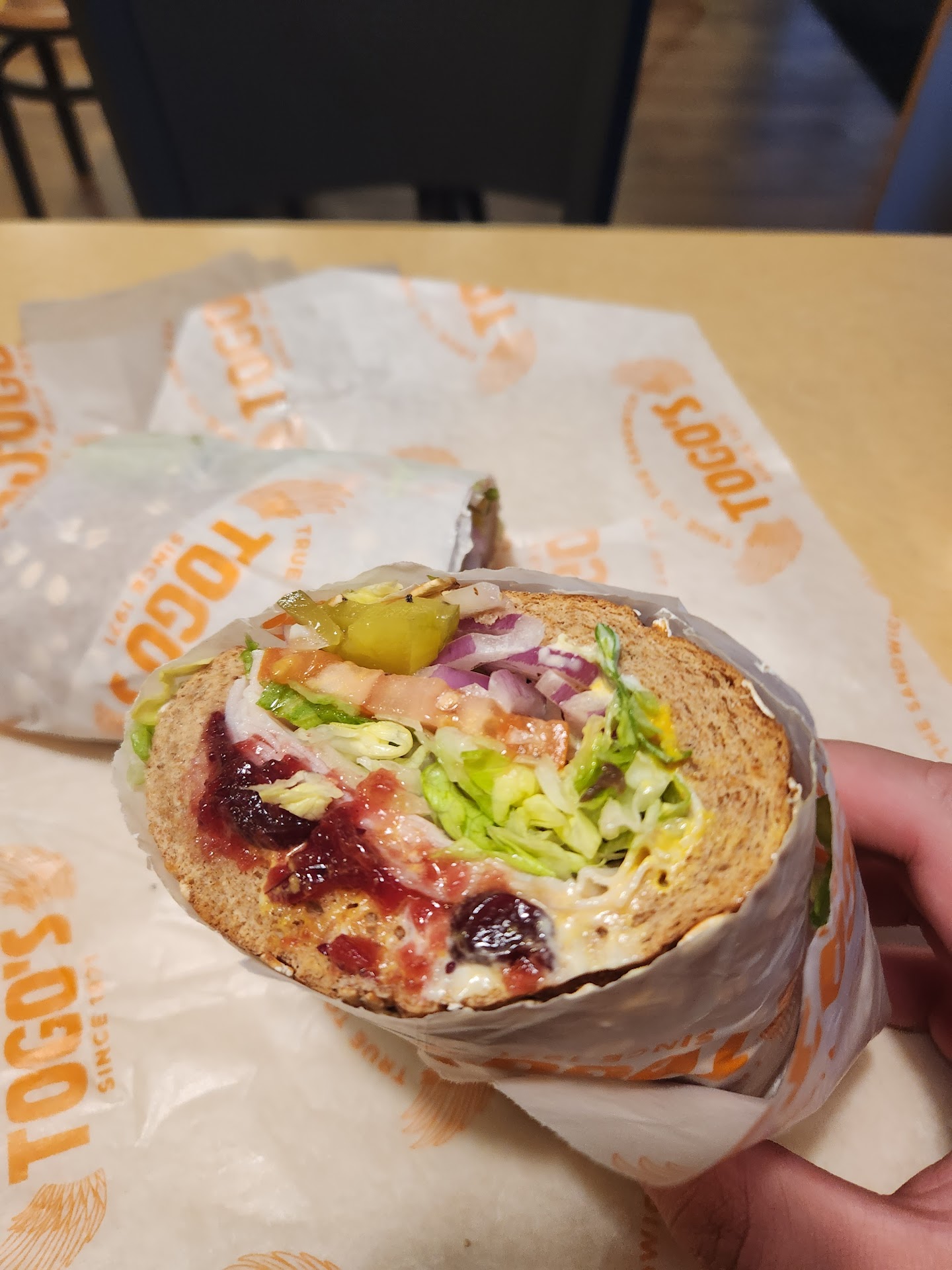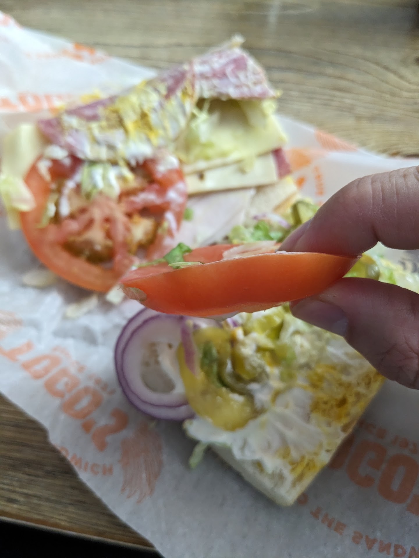 2nd sandwich was a Turkey/Salami which had the correct ingredients but the tomato they used is ridiculous. The slices were literally thicker than my finger - like a slab of tomato. They were so thick the sandwich wouldn't even close properly. All the meat was folded in half on one edge, and the giant chunks of tomatoes were thrown on the other edge so that everything just dumped out when it was unwrapped. See the attached pic. Even if someone DID accidentally cut uber fat slices of tomato like that why in the world would you decide to put that particular piece on someone's sandwich? C'mon.