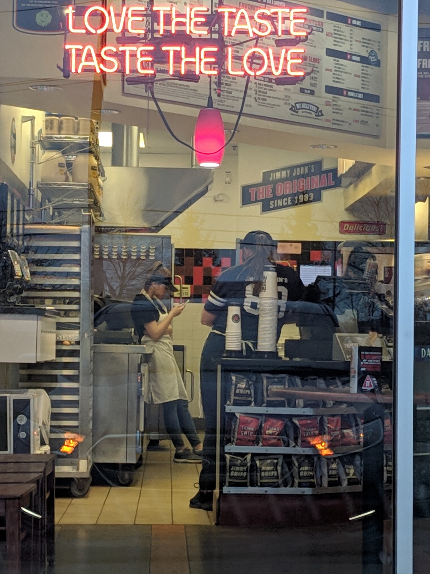 Read moreIt's freaky fast because there are 10 employees here for the work of max 6 people. 10 people and no one's stepped out to clean tables in the last half hour or put down the floor mats even though it's 11:30. Oh and somebody's friend from Dunham's just stopped in to flirt with the staff and manager (or whoever does the slicing). This place makes a great argument for not raising the minimum wage. This manager needs help or help out the door, somebody's money is being wasted in such large amounts I'd call it theft. Average Jimmy's sandwich, poor customer service besides the standard greeting at the door, and just...