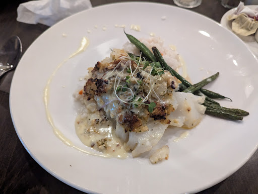 We split the brie en croute app, which I liked a lot. My only quibble is that I would have made the berry coulis denser to compete with the brie a bit better, but overall it was a refreshing way to start the meal. I didn't build up quite the appetite I was hoping for from metal detecting in the afternoon (which is one of the many negative consequences of a drought), so I went a little lighter than usual on the entree with the almond-crusted cod. It was tasty but presentation-wise? Eh. It's not really a fish you can "crust," if that makes sense, so the optics are a bit chaotic. It's more like a pile on your plate, which you can see in the attached photo. I did like the fact that the lemon sauce was on the subtle side - the citrus family is not one of my faves and it's often an accompaniment with seafood dishes, so I was pleased it wasn't the dominant flavor. Super flaky and loved the texture of the rice.