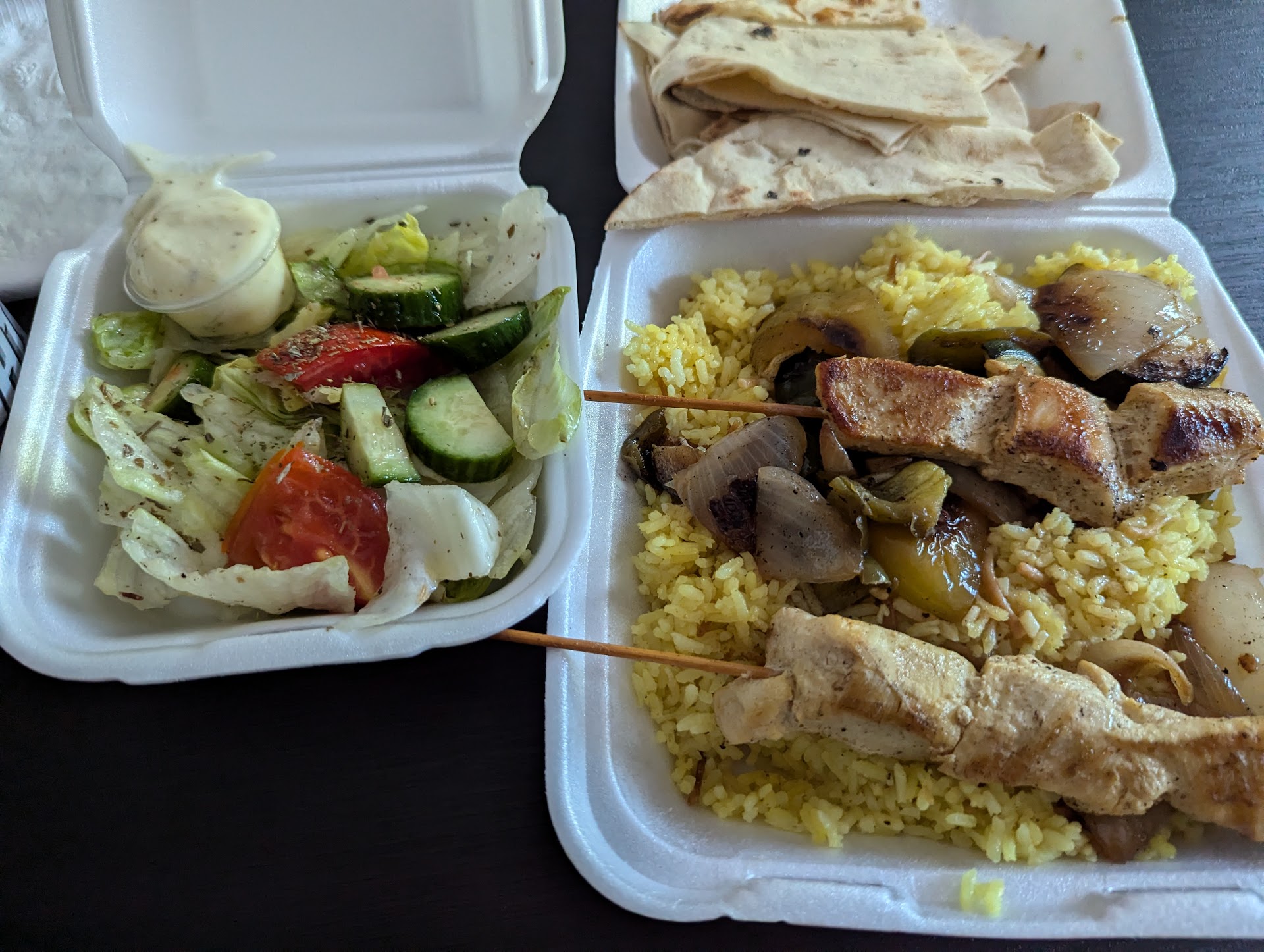 When I picked up the to-go order I was exciting since it was damn heavy, naively thinking it was going to be a decent amount of kabob. I was sorely disappointed when I opened it. There was a single kabob (medium sized AT BEST), but there was a monolithic amount of rice pilaf and salad that was included with the meal. The un-spiced flatbread was uninspired and tasted bland. The salad had a really weird off flavor to it, like somebody had spilled some damn soap in it.