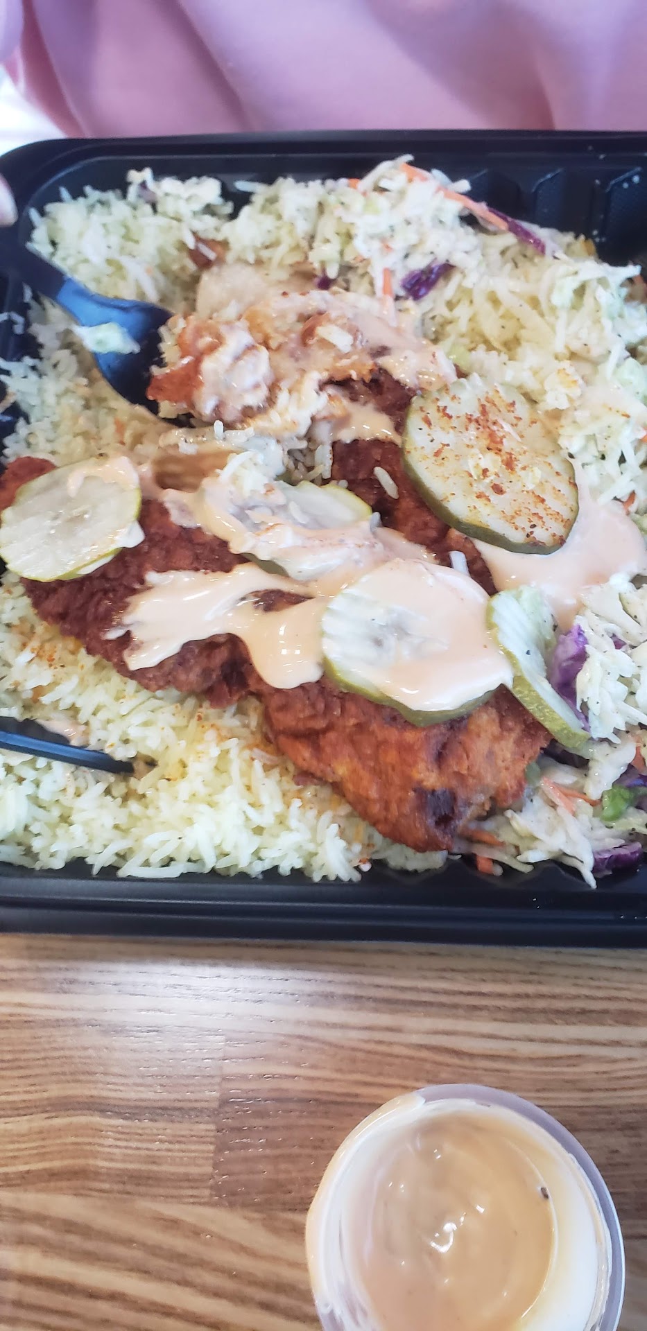 Read more(Blackstone location) Literally the WORST food I've ever purchased! And I was really suprised since my oldest son loves the Hanford location. I sent him a picture of my food to ask "... did I order right?! because this is terrible!" and his response was "what the hell is that?!... I'll take you to the Hanford one to try their food." Long story short at Blackstone; the "buttery rice" was neither buttery, nor seasoned, nor salted or even fully cooked. The mac&cheese was literally noodles with watery-milky juice (definitely not even "sauce" consistency), the chicken was soggy yet overcooked at the same time, and their "house sauce" was just icckkk. The pickles were good.
