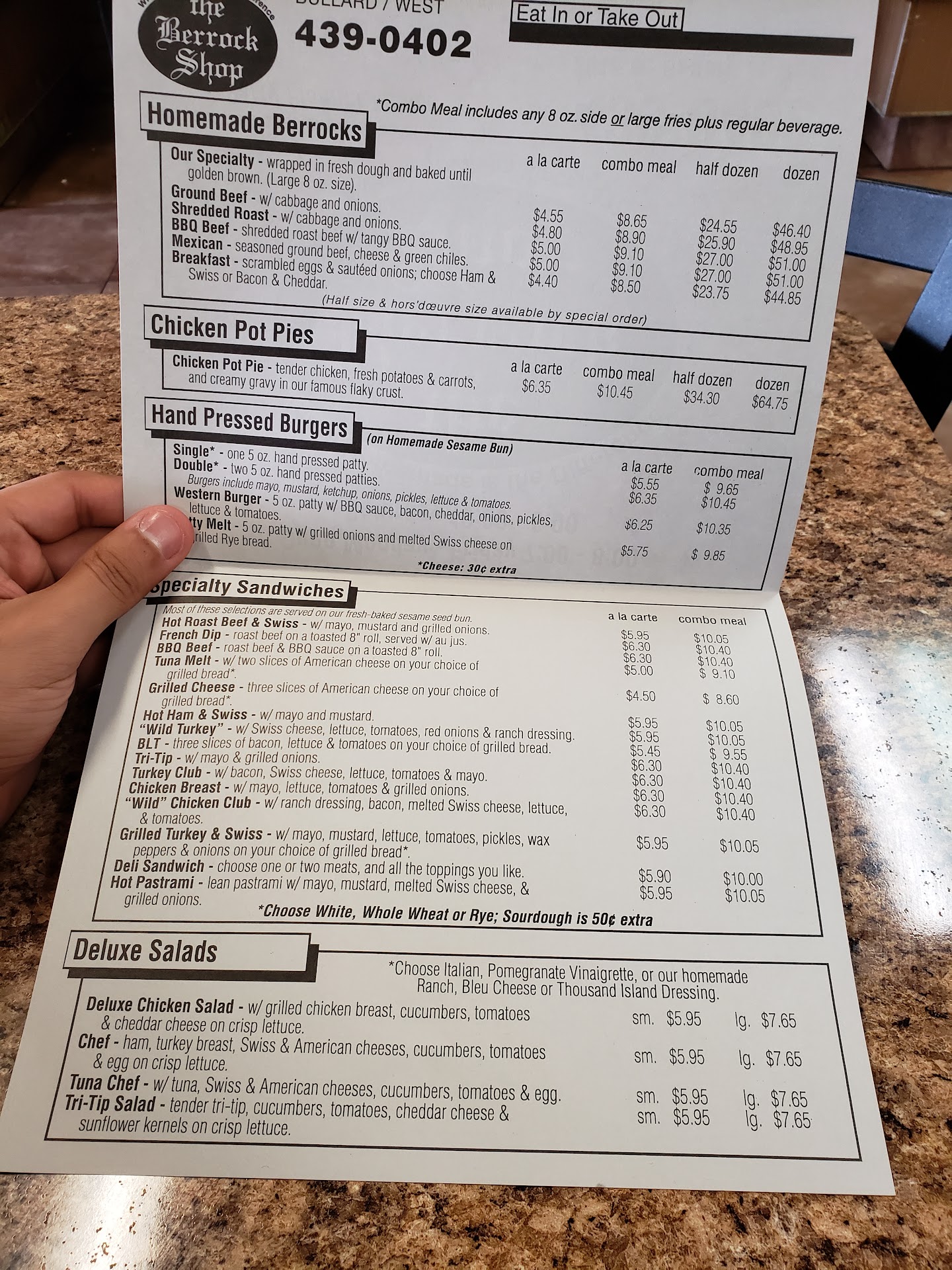 Read moreMy adorable Mother-in-Law brings home food from The Berrock Shop just about every other week, so I'm very familiar with the food, especially the pot pies 🥧 (which are screaming btw), but i had never actually visited the restaurant in person. I finally did, last week, and it was a good experience. I guess i probably expected to see more German or Russian representation (or wherever the berrock originated), but it seems like a regular, normal american restaurant with kind, helpful people working and absolutely delicious food! I ordered the western burger 🍔 and just the patty by itself felt over a lb. The bun was the best part, it was "homemade" (just like their pot pies' crust) and was fluffily scrumptious. The fries 🍟 were okay, but then again, I'd probably like them better if i could still eat salt (my diet won't allow it), but i ate most of them without ketchup, which only can happen with GOOD fries. All in all, yes it's great, yes it's definitely worth the cheap prices they have, and yes i will be returning soon to try out the pulled pork or tritip...
