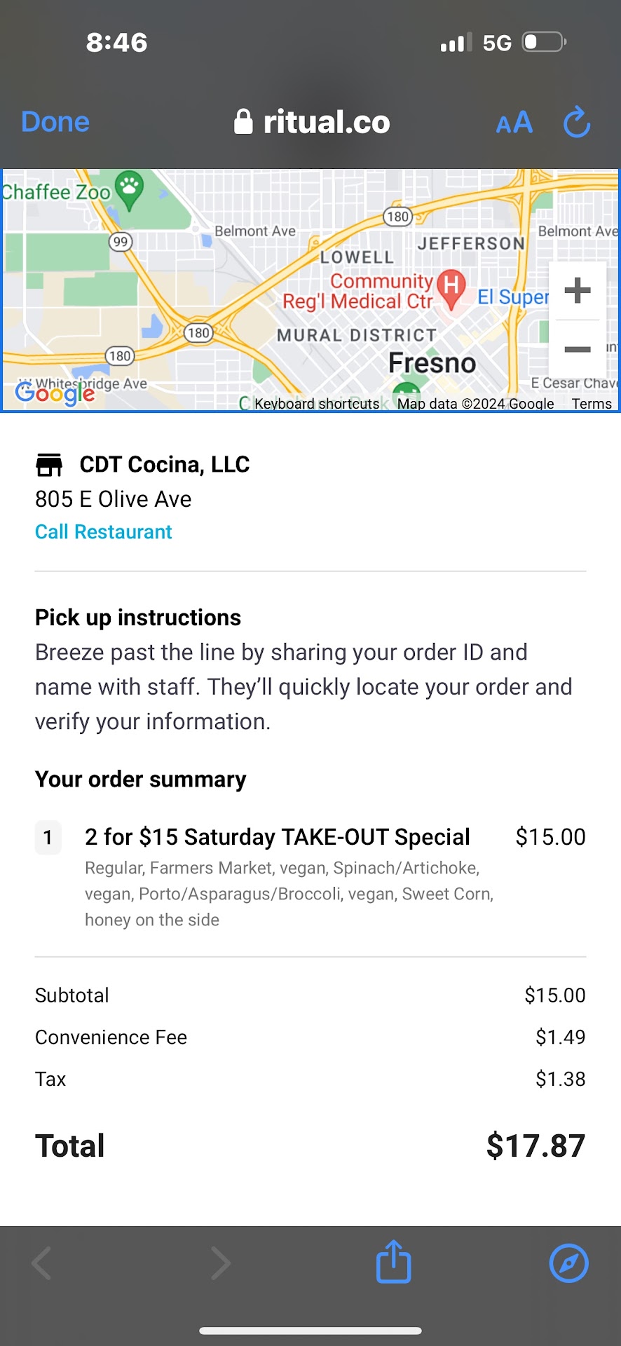placed an order for the saturday special thinking if its available its saturday and the order went through and charged my account as well as gave me a pick up time. I arrived 30 minutes later when the notification said it was ready according to the ritual app that was used for the online order. the restaurant claimed they didnt accept the order but the ritual app showed they did. i showed the cashier what it said on my side and showed that the money was pending from my bank account. they didn’t make any order but instead told me they would have to charge full price but i asked for a refund. the restaurant knew the refund was available since the time the order was placed but they chose to wait til i got to the restaurant to make that call. i would’ve not came and wasted my time and gas that way. we could’ve resolved it and i could’ve came on the correct day the special was available. this is sloppy customer service. the worker cristina was not very helpful at all and had a passive aggressive tone with me insisting its my fault for not reading the order saying Saturday special. any other online ordering app would simply not have the special available til the specific time and date it’s available. it wouldn’t have taken my money and it would’ve clearly told me my order was not accepted by the restaurant. Cristina claimed she called to have it fixed but i did not see any of those calls and having been experienced with online ordering apps , restaurants shouldn’t have to call i shouldnt have to deal with the restaurant over a call or else i wouldve called to place the order. if your app is causing problems then you should then make it right yourself as a restaurant and be more proactive with your apps. my order should have been made to go and your restaurant should do it part to make sure the special ordee can only be placed during that time.this is the first time i used this app ritual and compared to my usual doordash and grubhub this app did not work well. overall bad experience. i was also giving this place a chance again since having been disappointed in the food the past two times hence why its been months since i ate here. i assumed a discount would be worth the risk. possibly the worst customer service ive had in...