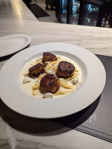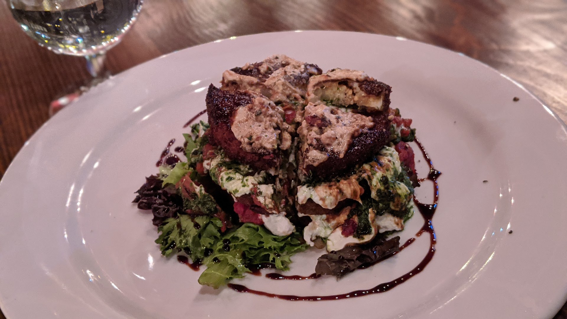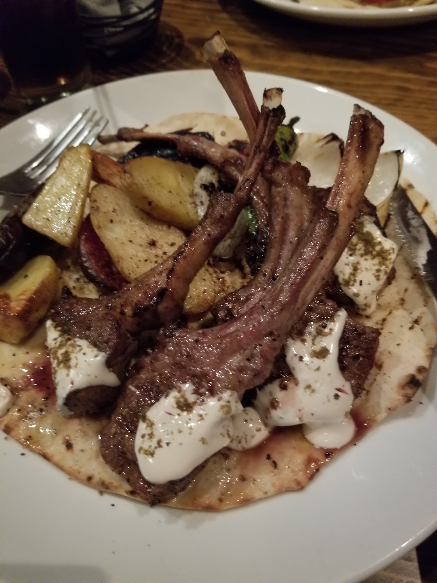 Read moreWe made a reservation and drove up from Porterville. Our table was ready when we arrived. It was easy to find via Google Maps and parking was available. It is a rather dark atmosphere inside with dark wood and dark banquettes on the walls. The menu is not huge, but it is adequate to choose a number of items from and several specials were made known to us by our AMAZING server. Her name was Lauren. She took very excellent care of us. After perusing the menu, we decided that the Brussels sprouts sounded good and the bone marrow which was one of the specials Lauren had described to us, just on the merit that it was bone marrow, was also ordered. I ordered a stilton salad and my companion had the soup of the day which was a seafood chowder. While there was an amazing opportunity to try a delicious sounding pork tenderloin, we both opted for the Shawarma spiced lamb chops. The bone marrow came out hot and sizzling, and you can tell it was intended for one diner as there were only 3 pieces of small grilled crostini with it. It was super delicious. Fatty, flavorful, collagen loaded and gelatinous, just as it should be with a hint of lemon, garlic and parsley. I could have just sat and had them bring me marrow bones on repeat. They were just delicious. The Brussels sprouts were very good as well, with lots of bacon and the whipped goat cheese was so good, whipped so well, it was almost like soft butter! The stilton salad was not lacking in stilton, or in bacon. Unfortunately, I forgot to snap the photo. It was 3 wedges of romaine, lots of bacon, drizzled in a honey / syrup, with some pieces of pear and a couple of candied walnuts. To me, the walnuts and the pear, served to corners of the plate, were not a feature of the salad, and while they tasted very good, I'm not sure they were necessary. The main course which was the lamb chops, were absolutely beautiful and delicious. This plate has been very well thought out and presented. The seasoning was delicious and the cooking of those chops was perfection. Served on the Zaatar flatbread was so clever, and delicious. The roasted fingerling potatoes tasted like they literally just came out of the oven and the grilled vegetables had gotten just close enough to the roasted jalapeños to pick up some heat. They were just delicious and the plate came together so well with the drizzle of the tahini sauce. I think if I had gotten a glass of shiraz to pair with the meal, it would have just set it off perfectly! Unfortunately, we did not have room for dessert, but all we heard about was the bread pudding and how delicious it is. Next time, we will get dessert first and try it. Yes, next time, because we will definitely be back! Thank you Lauren for the amazing experience...