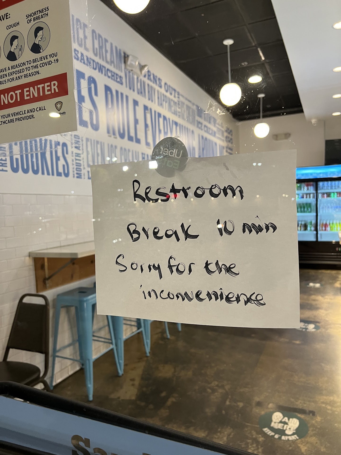 Read moreWhen we first got here, there was a sign up saying restroom break, be back in 10 minutes. Thought that was really weird, never seen a "restroom break" sign before, but now seeing other reviews on this place saying the same thing. Well after waiting 25 minutes, a young kid in sweatpants comes and opens the door and takes the order of a family that just walked in instead of mine. When I ordered he gave me a waffle cone I didn't ask for, then upcharging me $1.50 for it when the menu only said it was$1.00. Called him on it and he said oh the waffle cone is more expensive based on how many scoops you get, so since I got two scoops, the waffle cone was $1.50 instead of a dollar. Not that that makes any sense, but at least update your menu to tell me that, I mean come on. It's a digital menu. It's not that hard to update. Also, the mint chocolate chip ice cream very sandy texture. Not sure why it was weird. I've never had ice cream be sandy before but the mocha chocolate fudge was very good. I will say they had plenty of options and I would say I would come back if the staff and incorrect menu pricing...