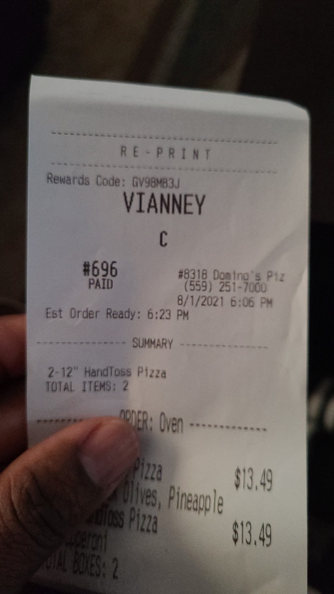 Read moreI had a worker who kept my credit card during the week - As always, I placed my order with this Domino's location and they delivered it - I have EVERY SINGLE SOLITARY PIECE OF INFORMATION ON THAT CARD MEMORIZED, by the way - and brought it right up to my door - And I was starving!! And I couldn't Wait to eat one of those piping hot sandwiches! And because I couldn't produce my card- because my worker had it, but it was obviously ME - but the delivery JERK didn't care, he would not give the order to me - so he called his big boss back at the office, and the JERK MANAGER said, "Bring It Back". And I did without my sandwich that night, and the next night as well. Bring it back? Isn't that a little, I don't know - extreme and cruel? So tonight I'll see, after All These Many Months - whether they skimp or are rude or just what. Because I feel like I'm going behind Mountain Mike's back and cheating. The last time I had a sandwich from here it was pretty puny. Had one across town the other day and it was fabulous! Yep. Can't wait for my 2 weekend sandwiches. Tune in...