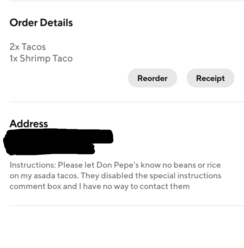 I recently went to order again and I see that Don Pepe's removed the option for special order instructions, so I put my request in the comment box on the payment page requesting no rice & beans and they still got my order wrong! I told my boyfriend that I feel like they were messing with me, because they put beans and no rice on one asada taco, nothing on the other, and rice on the shrimp taco. Do they read the special instructions? They also gave me NO kind of salsa, red or green, no lemons for either 3 of my tacos, and most upsetting of all - not even any cilantro or onions. I thought I had no words to describe this experience, but I can just say I'll never eat here again. Pics provided for reference.