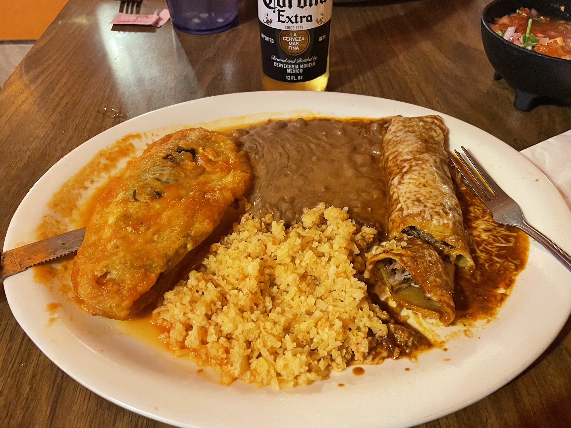 Nice waitress and prompt service. You can’t get a margarita (except a bottled wine one that’s around 5% ABV) so if that’s a must with your meal this place is not for you. I can’t recall anything exceptional about their chips and salsa. I ordered the usual: Chile relleno and decided to give their carnitas enchilada a try. The Chile relleno had really great flavors (nice fresh poblano chile) but I think it was a bit undercooked, as the cheese was not fully melted; nevertheless a decent chile relleno. The enchilada had a sauce that was unfamiliar to me but delicious. I loved their beans and rice. Glad I had a chance to...