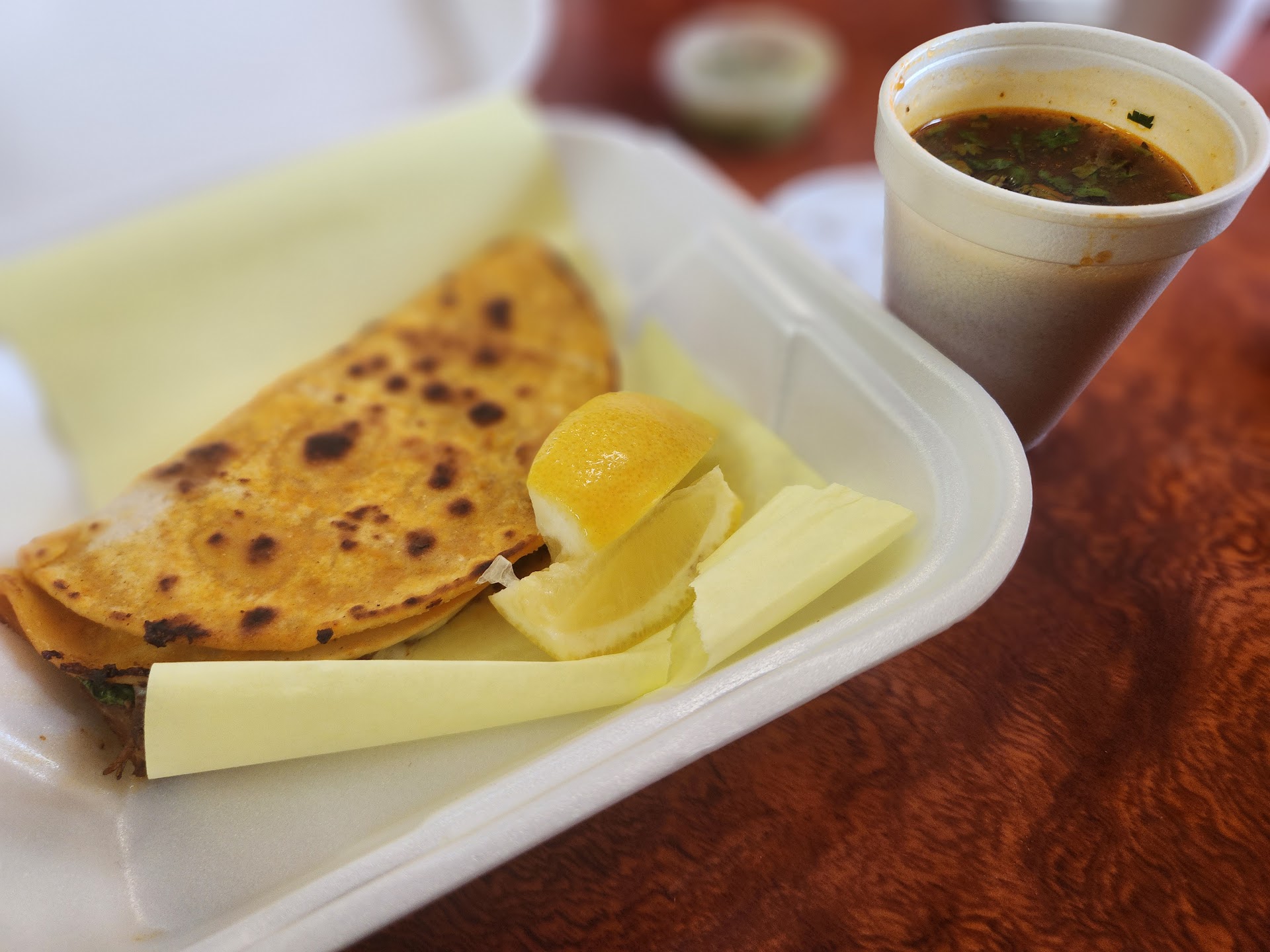 One of the best and kinda the first Birria taco I've ever had... So delicious, juicy, spicy beef packed with flavor and cheesy goodness. The spice kicks in as you eat. Perfect balance not too spicy. Perfect for me I'm a mild spice kinda Girl but, I'd say this spice was definitely a medium on my chart. It was not the kind of spice that takes away the Natura good flavorful your food. My 🍯 recommended this place, his family members gave him a sample so, we definitely had to try them together... A small business, looks family owned. Small seating area but,l Perfect for a couple of people to dine in or place to go orders for pick-up. I highly recommend and yes!!!! We're going back more often. Oh, forgot to mention this delicious juicy beverage gave me hint of cherry vibe in the beginning but, as I sipped more I think it was definitely cranberry with a light sweeter twist. It was...