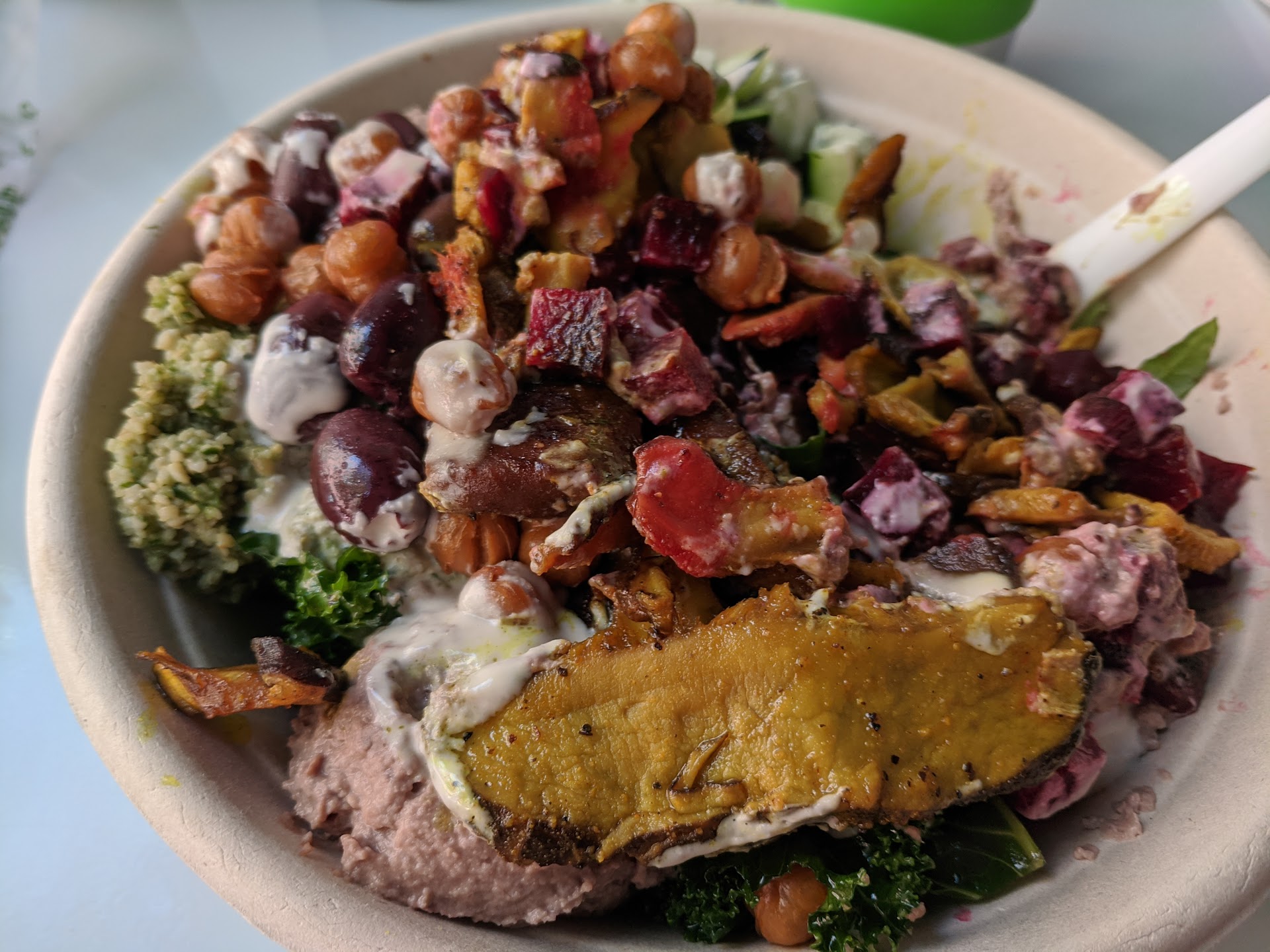 The hummus is amazing, especially olive. I love that I could mix & match protein options. I got a mix of the vegan beef and mushroom shawarma. Both options were very tasty. Mixing proteins is great for someone trying to eat a more plant based diet since you can mix the meat options with the veg options. The food is very filling. My bowl had three scoops of hummus plus the vegan beef, giving me roughly 40g of protein. I was also able to get a lot of veg including my favorite, beets. The tabbouleh was really good too. The lemonade options are awesome too. I loved the turmeric ginger lemonade. The combo of high protein, beets and turmeric means this is going to be my favorite lunch on days I'm working out.