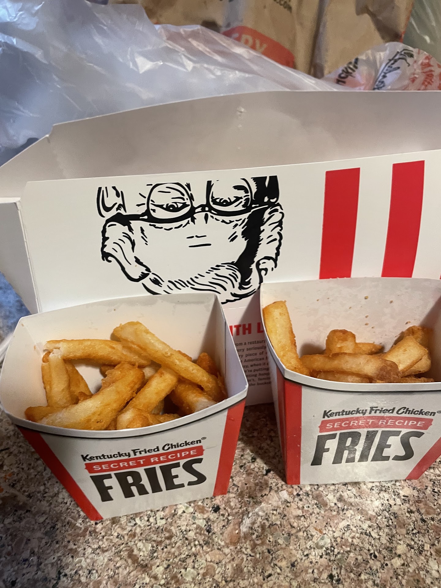 Read moreI JUST got home, against my better judgment did not check order. Offered to upgrade my orders to a LARGE. Instead of 2 LARGE fries I received only one Almost LARGE fry spit in half (refer to pics) old petrified tenders , and no sauce! $20 + down the drain. I tried contacting location on KIngs Canyon Rd, busy signal the phone is off the hook as not have to answer to or resolve issues resulting from poor business practices. So it’s makes more sense for KFC HIRED help to cheat customers , ($20+) than to do their job and prepare orders, and or communicate/clarify shortages/out of stock rather than UPSELLING almost empty containers. It’s no so much about the fries the intentional cheating .. Why upsell an item they know full well is low and or not available.. Just out of convenience?! I understand there are certain practices and procedures employees must follow in regards to inventory, I get it however if laziness isn’t the issue , than KFC on Kings Canyon Rd should consider closing earlier if low or no inventory leaves employees having to resort to ripping customers off or at least train them to be honest and communicate menu options. Not upsell/swindle all with a rude attitude .. I do not recommend this particular location. Don’t waste your Time,...