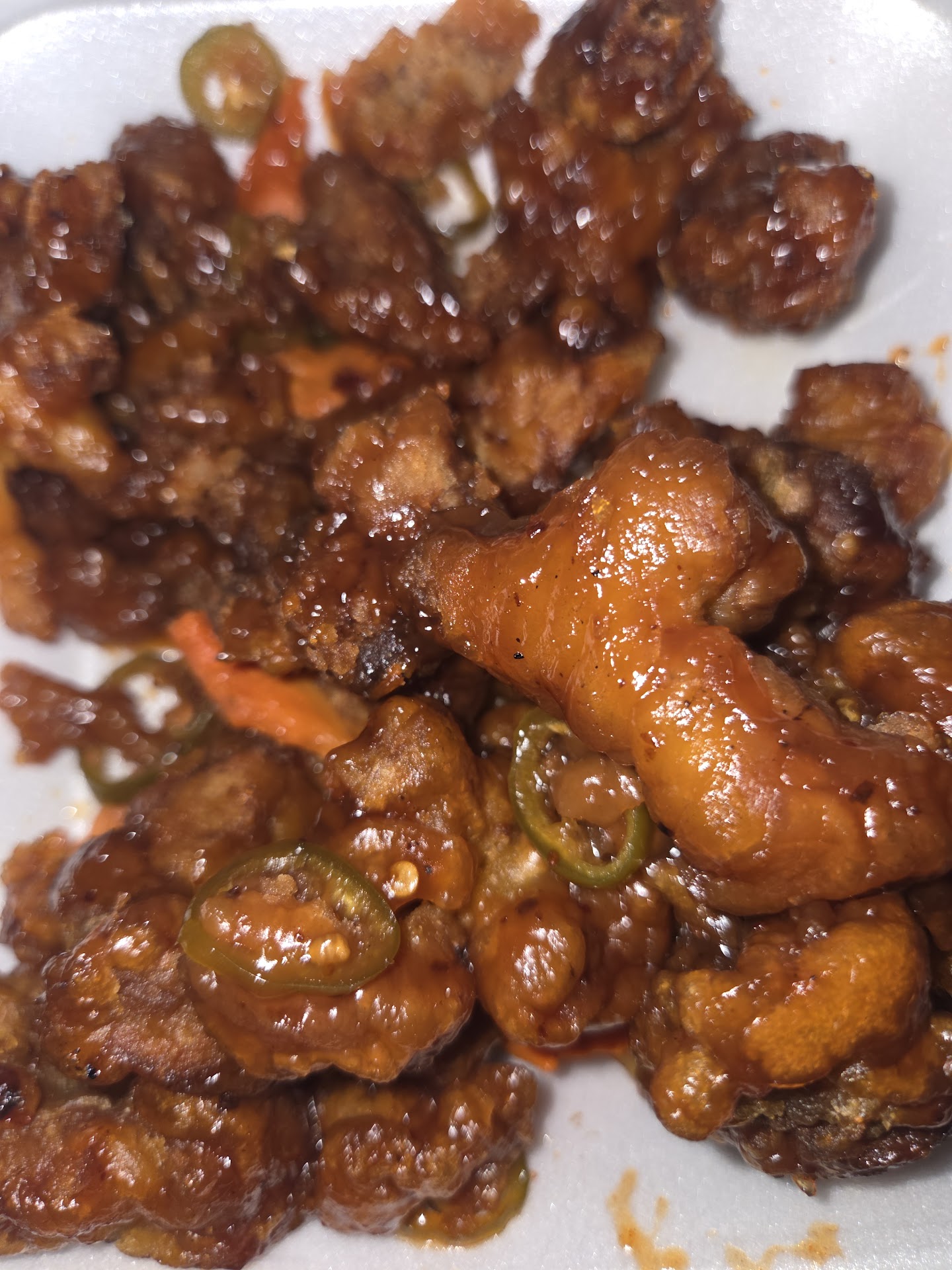 They did at least make the orange chicken spicy. But those dark pieces are that dried out scribbled fry skin that they dipped in orange sauce and put it...