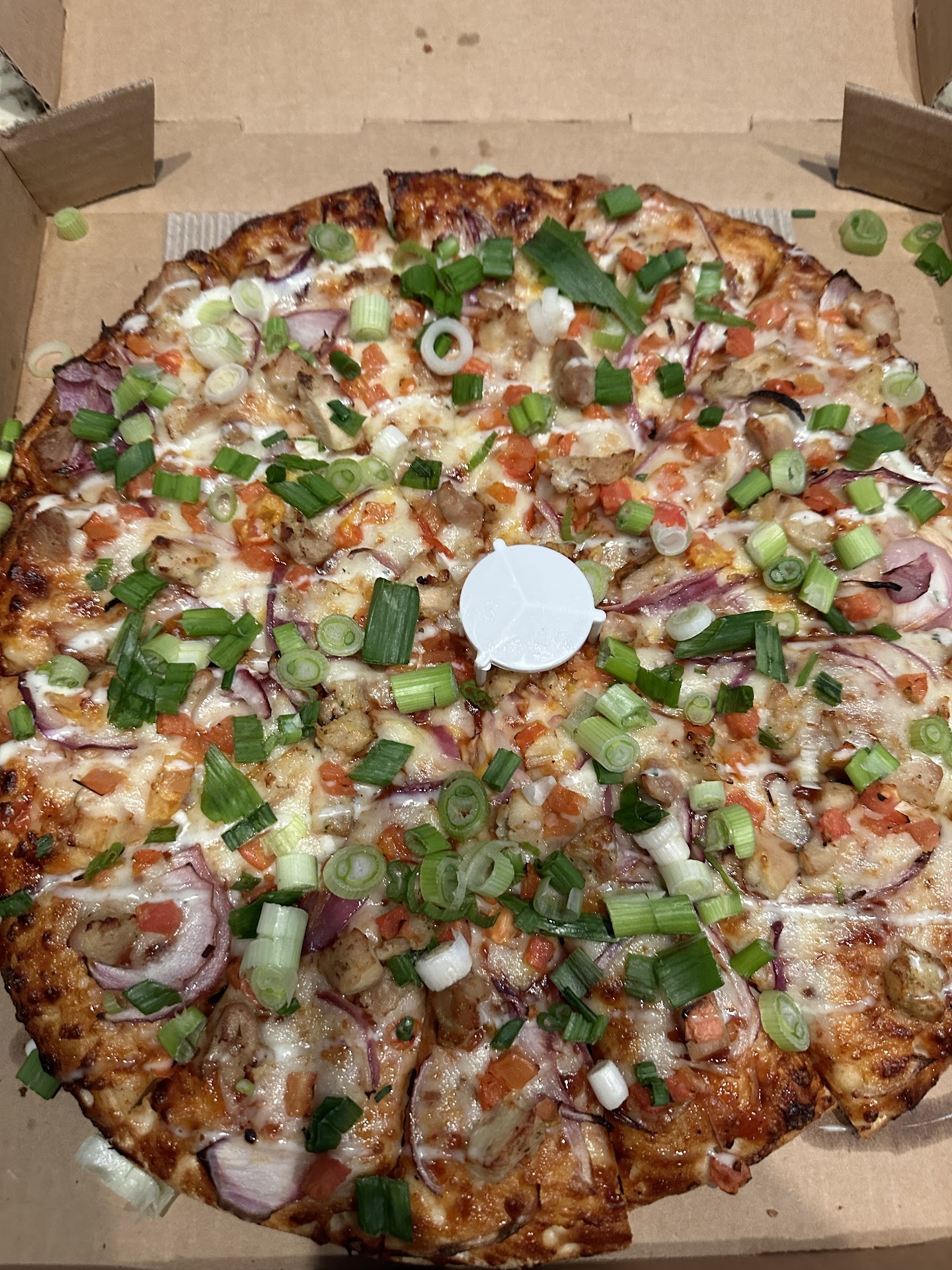 But the fun didn't stop there. I specifically requested no green onions on my pizza, as I'm not a fan of the little green devils. Lo and behold, when I got home and opened the box, it looked like someone had dumped an entire onion farm on top of it! I guess they mistook my "no green onions" request for "extra green onions." Bravo, Mountain Mikes, bravo.
