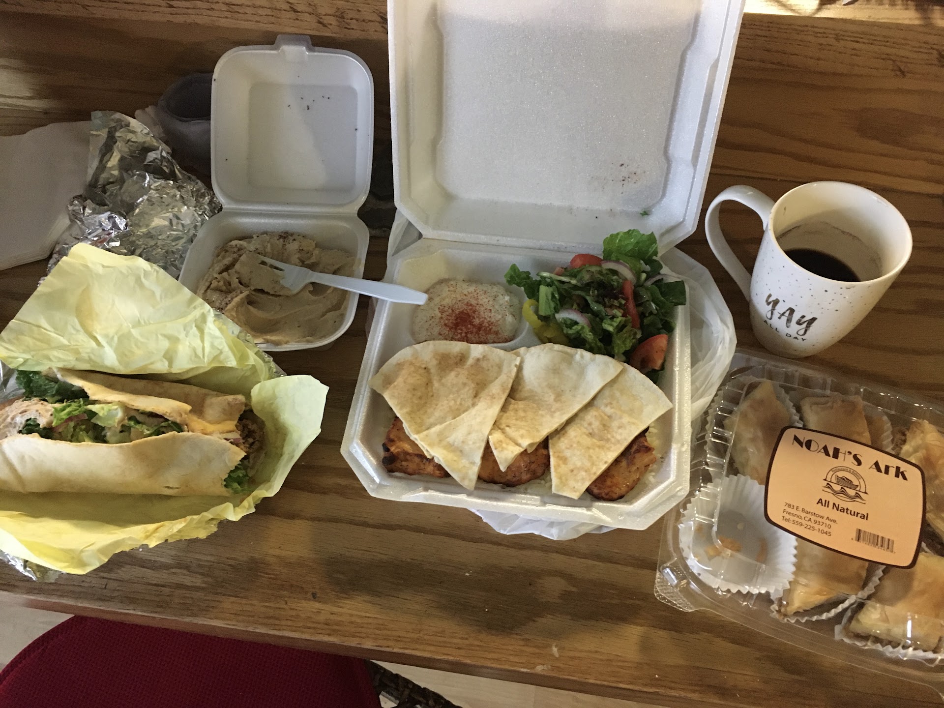 Read moreI went with a party of 25, which poses it's own problems. There was only 1 waitress, but she took the drinks and food orders quite efficiently. The food also came out reasonably quickly. My lamb kebabs were cooked medium, had OK flavour and were not too tough. One piece of lamb was cooked rare, and it was quite tasty and tender. One in our party ordered the lamb rack chops, cooked rare, but what she got was cooked medium. A different order of lamb rack chops had some chops rare and others medium. The rare chops were very tender and tasty. The rice pilaf was ok, I've had better from the frozen foods section. The salad was lettuce with a few slivers of onion and 3 bits of tasteless tomato. The salad dressing was quite tasty, with a dusting of sumac I think. The falafel was quite tasty, nicely crisp on the outside, with a bit of zingy spice to it. The salmon was perfectly cooked, well seared on the outside with a pinkish core, soft , juicy and not flaky or dry. It was also quite flavourful. The desserts, tiramisu, cheesecakes etc... brilliant! Yes, the desserts are worth writing home about. All the desserts were very rich, some were tasty without seeming sweet....very appealing to me who isn't cursed with a sweet tooth, but doubly dangerous to me who is cursed with diabetes. The salmon, falafel and rack of lamb chops (if rare) are worth a visit, and the desserts? They're worth driving...