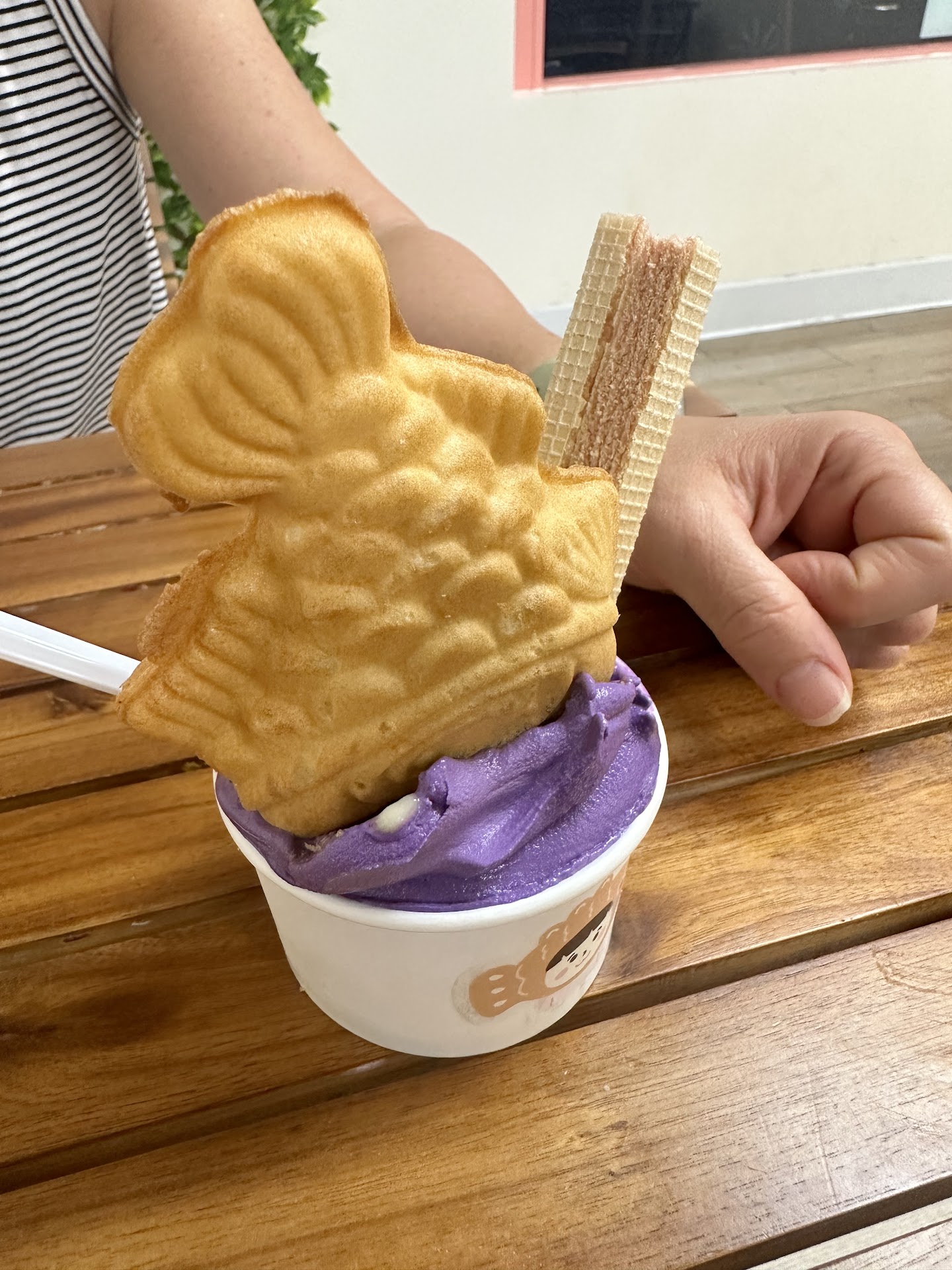 Read moreFirst time trying. I saw this place a few weeks ago passing by and didn't realize this was the same place at the mall that I've been meaning to try. Arrived about 30mins before they stopped serving. They were busy line was to the door and more people were coming in. The staff were so kind and very welcoming. It's a small place with 2 tables. Clean, simple but cute interior. They handled the busy rush so well. Didn't wait long. I ordered an ube soft serve with Nutella filling and chocolate drizzle with ube sticks. My husband ordered a strawberry ice cream with custard filling. The Taiyakis was made to order. It was crispy on the outside and soft on the inside and the flavor was good. The ube and the strawberry ice cream were delicious. The flavors were subtle but you could taste the flavor. We enjoyed our desserts. They were very generous with the strawberry scoops. We had a great experience! I would love to try the savory...