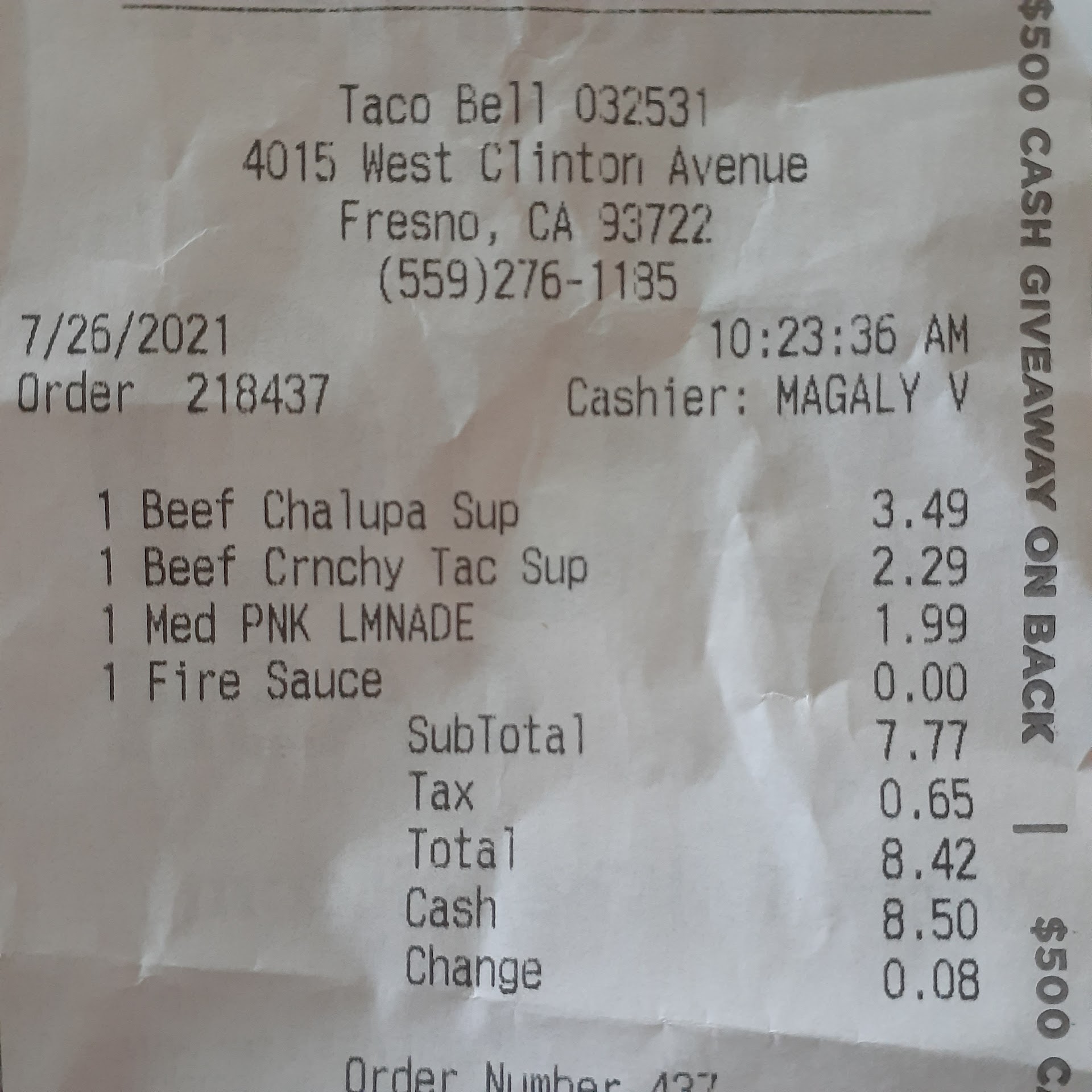 Read moreMy food was gross but the drive thru lady was super nice. I left a previous review about my horrible food but I thought it was only fair to come back and mention how nice the drive thru lady was as it was not her fault. But again the food was very disappointing. Wish I would have just ate burger king which is in the same parking lot. The 5 stars are for the employees Magaly V. as listed on my receipt. She was the worker with the long pretty nails. The chalupa shell was hard and cold and the hard taco's meat was luke warm and shell extra soft like both had...